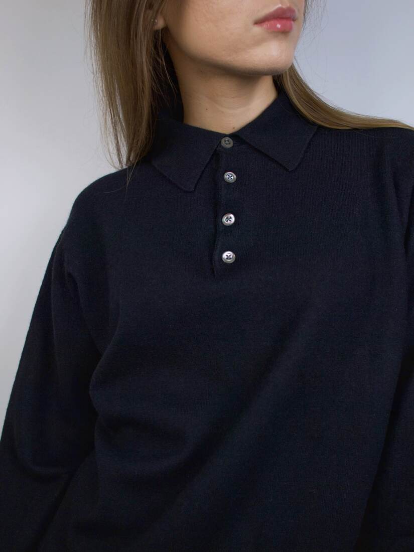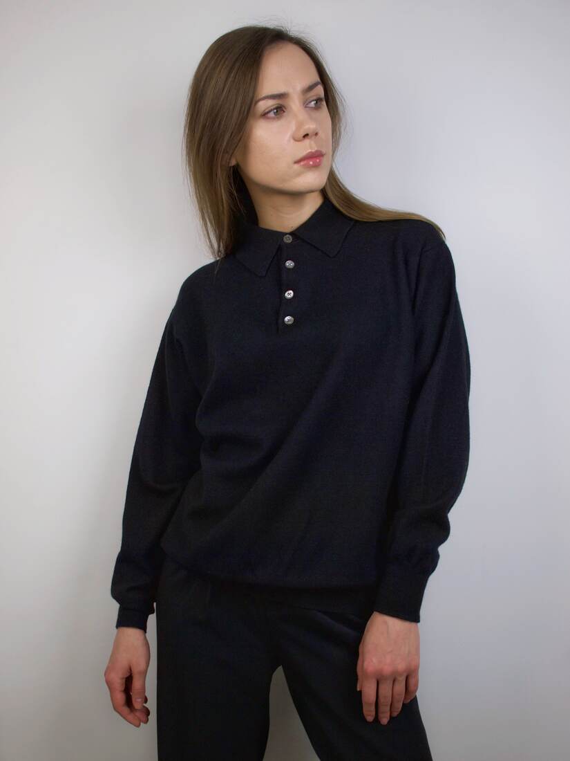 Sweter polo marki Gianni Bugli Milano. Wykonany z szlachetnej mieszanki wełny, jedwabiu i kaszmiru. Brak metki z rozmiarem, polecam na M-L, lub na mniejsze jako oversize. Sweter jest delikatnie sfilcowany, nie jest to widoczne i nie wpływa na jakość użytkowania, nadal jest mięciutki i miły w dotyku. Poza tym bez wad.