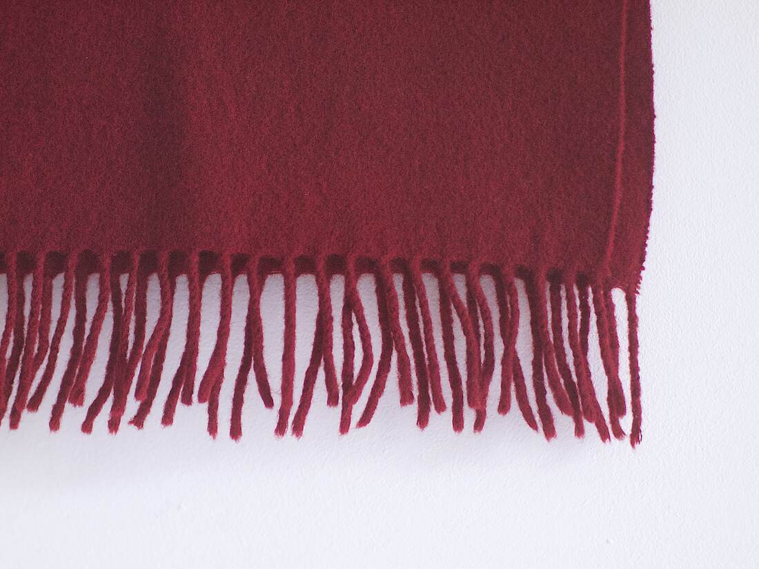 Szalik vintage, wykonany z mieszanki wełny i kaszmiru w kolorze wiśniowym. Brak metki z dokładnym składem, poza tym bez wad. Wymiary bez frędzli 113*26 cm.