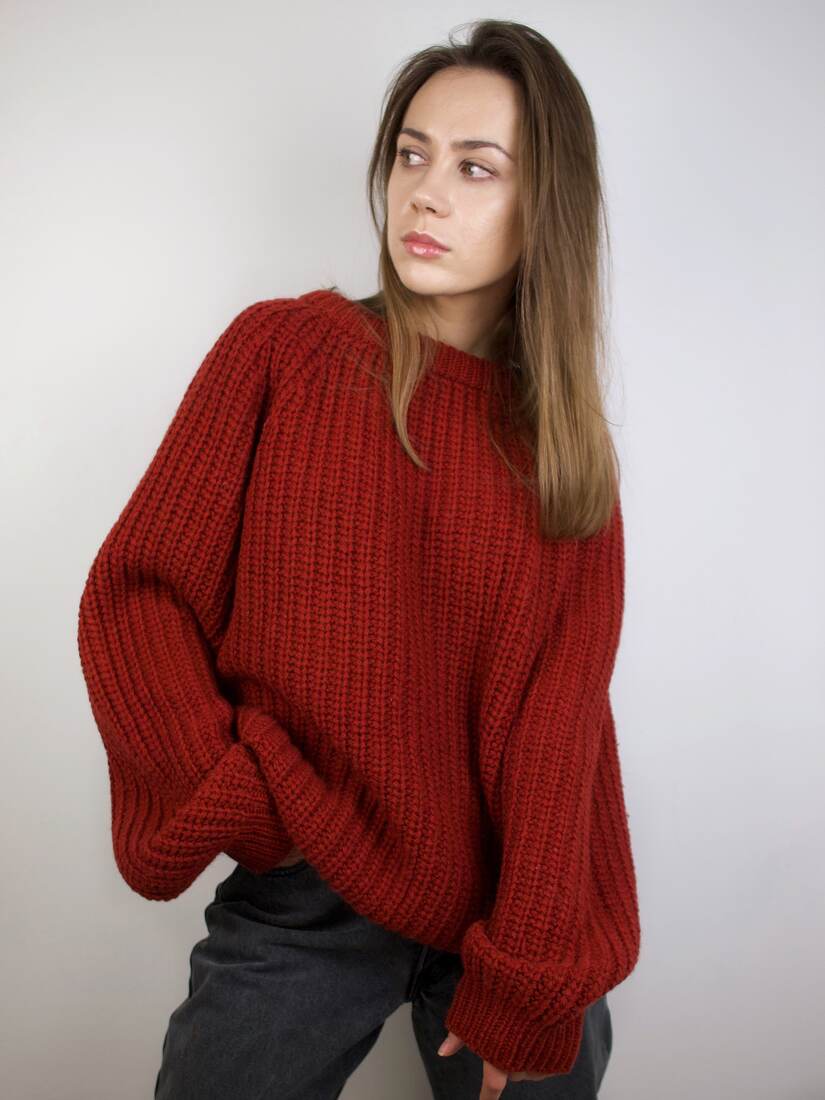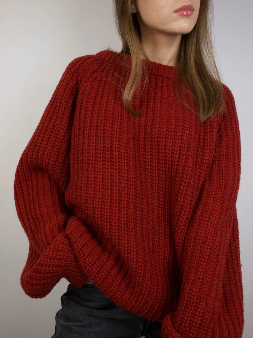 Ceglasty wełniany sweter o grubym splocie. Ręcznie robiony w Anglii. Rozmiar z metki L, idealny do stylizacji oversize. Bez wad.