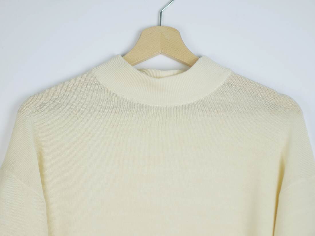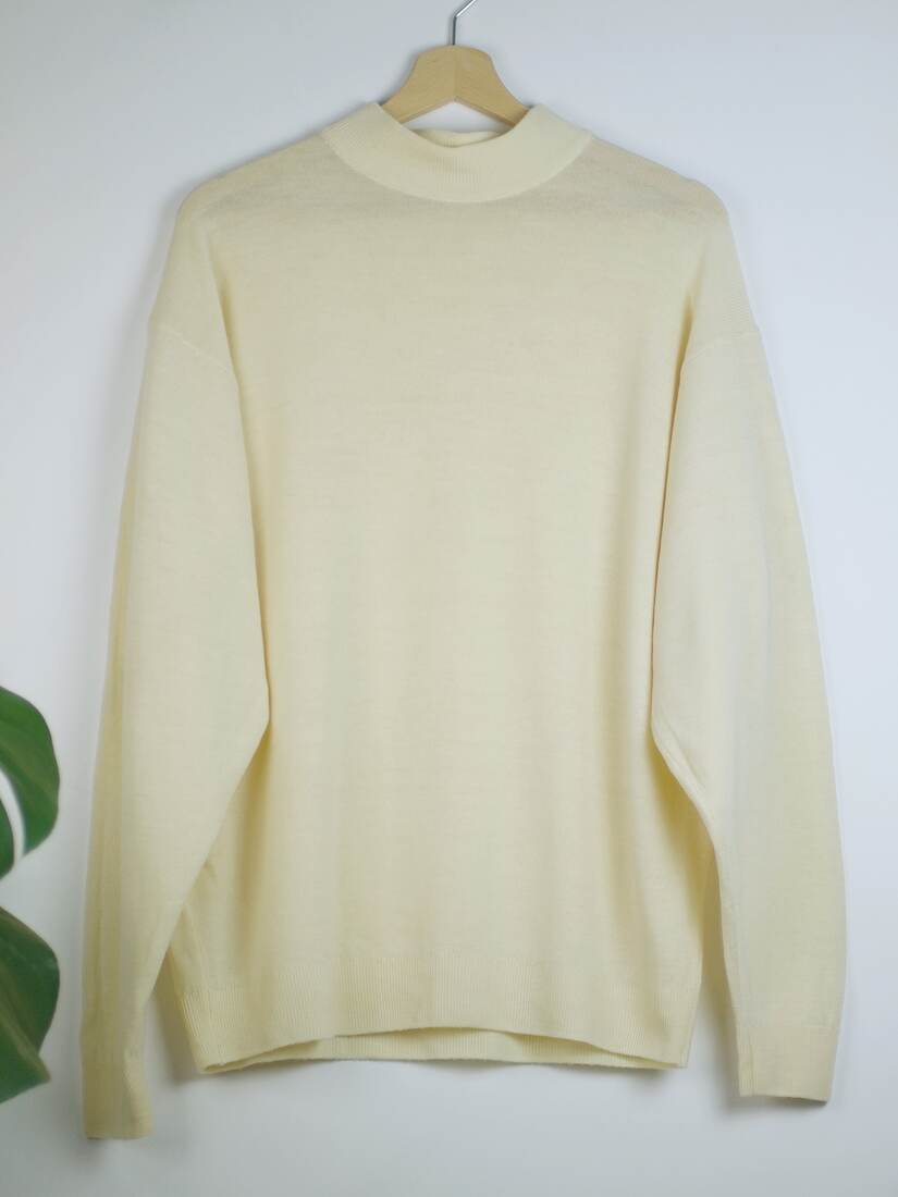 Kremowy wełniany sweter o obszernym kroju. Będzie pasować na L-XL, lub na mniejsze jako oversize. Bardzo dobry stan.