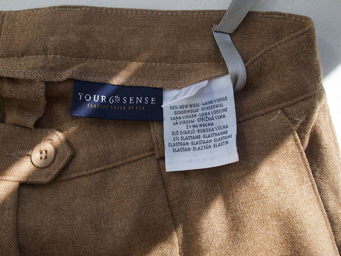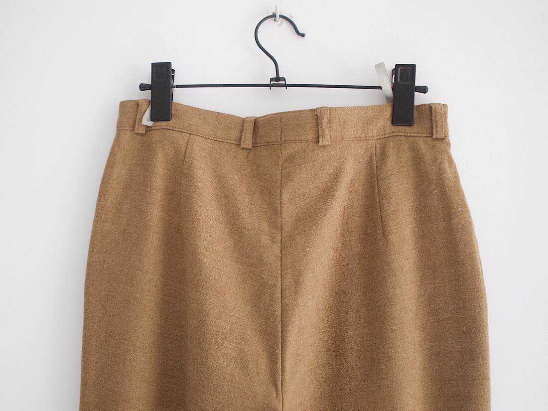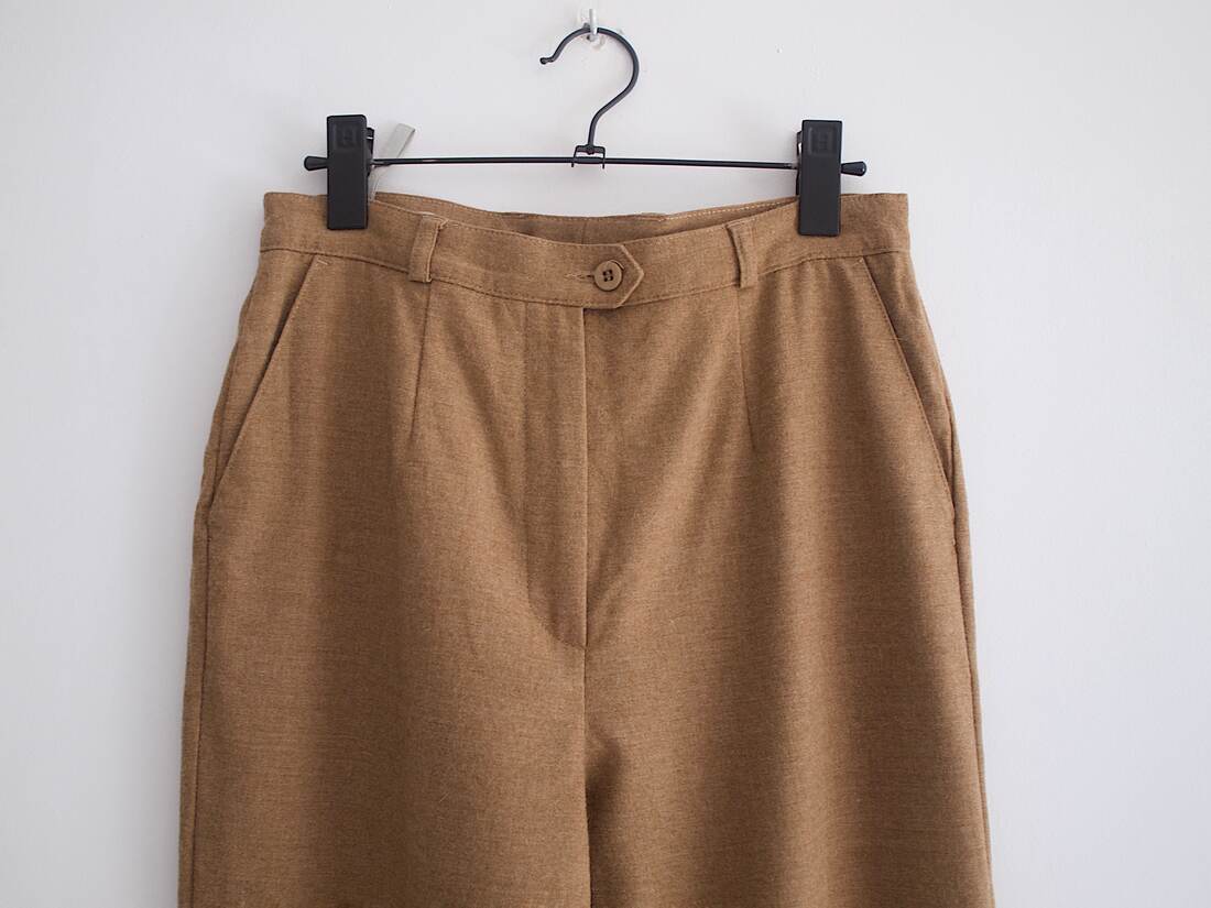 Camelowe spodnie wykonane z żywej wełny. Wysoki stan, kieszenie, szlufki na pasek. Rozmiar z metki M, bez wad.