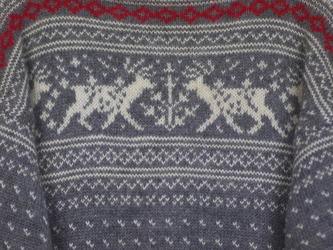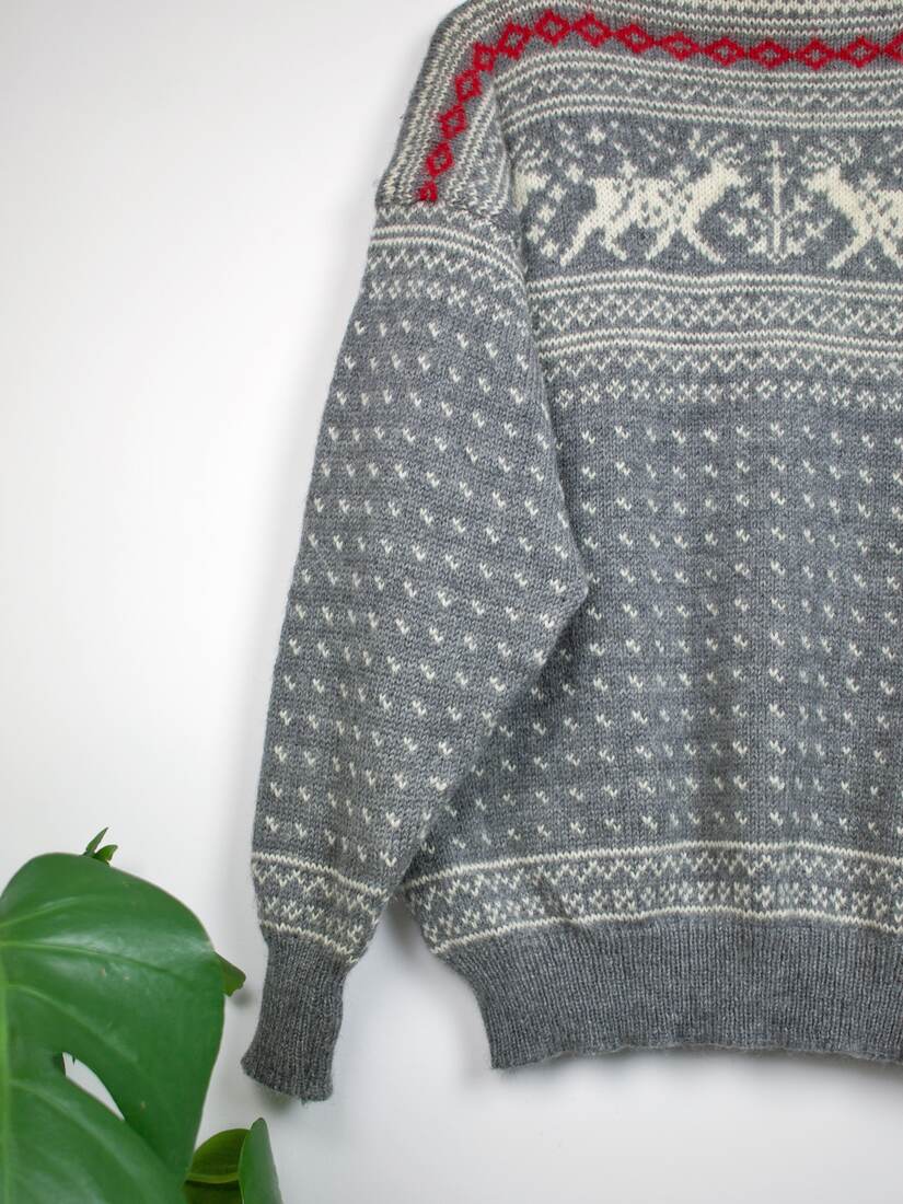 Wełniany sweter vintage we wzory. Luźny fason, dekolt w łódkę. Bez wad.