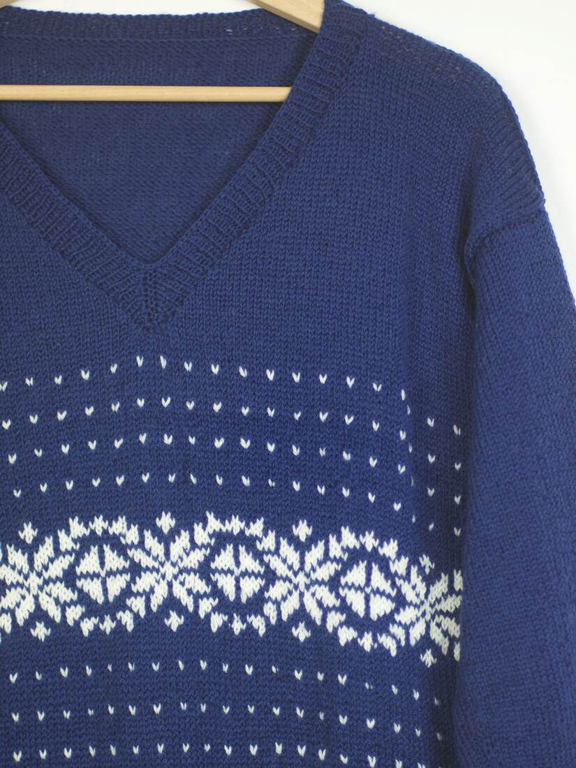 Wełniany sweter vintage we wzory. Luźny fason, dekolt w szpic. Bez wad.