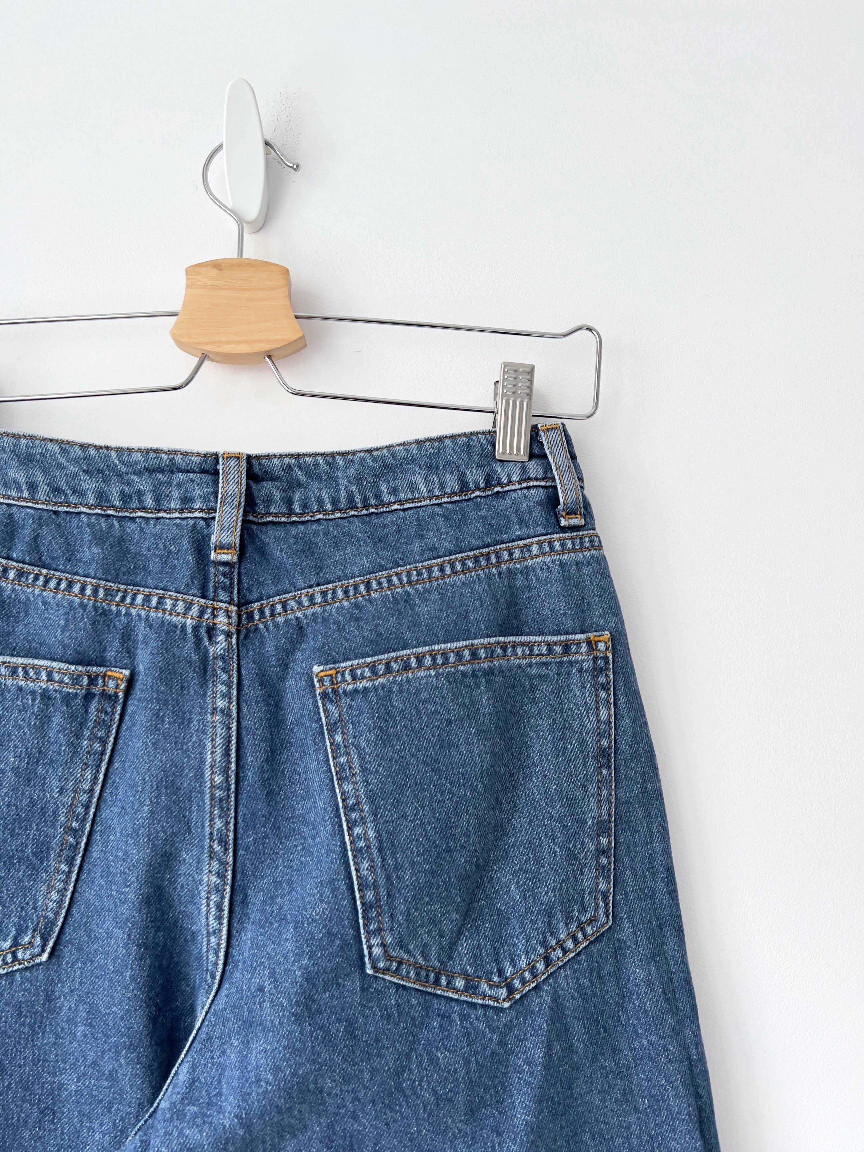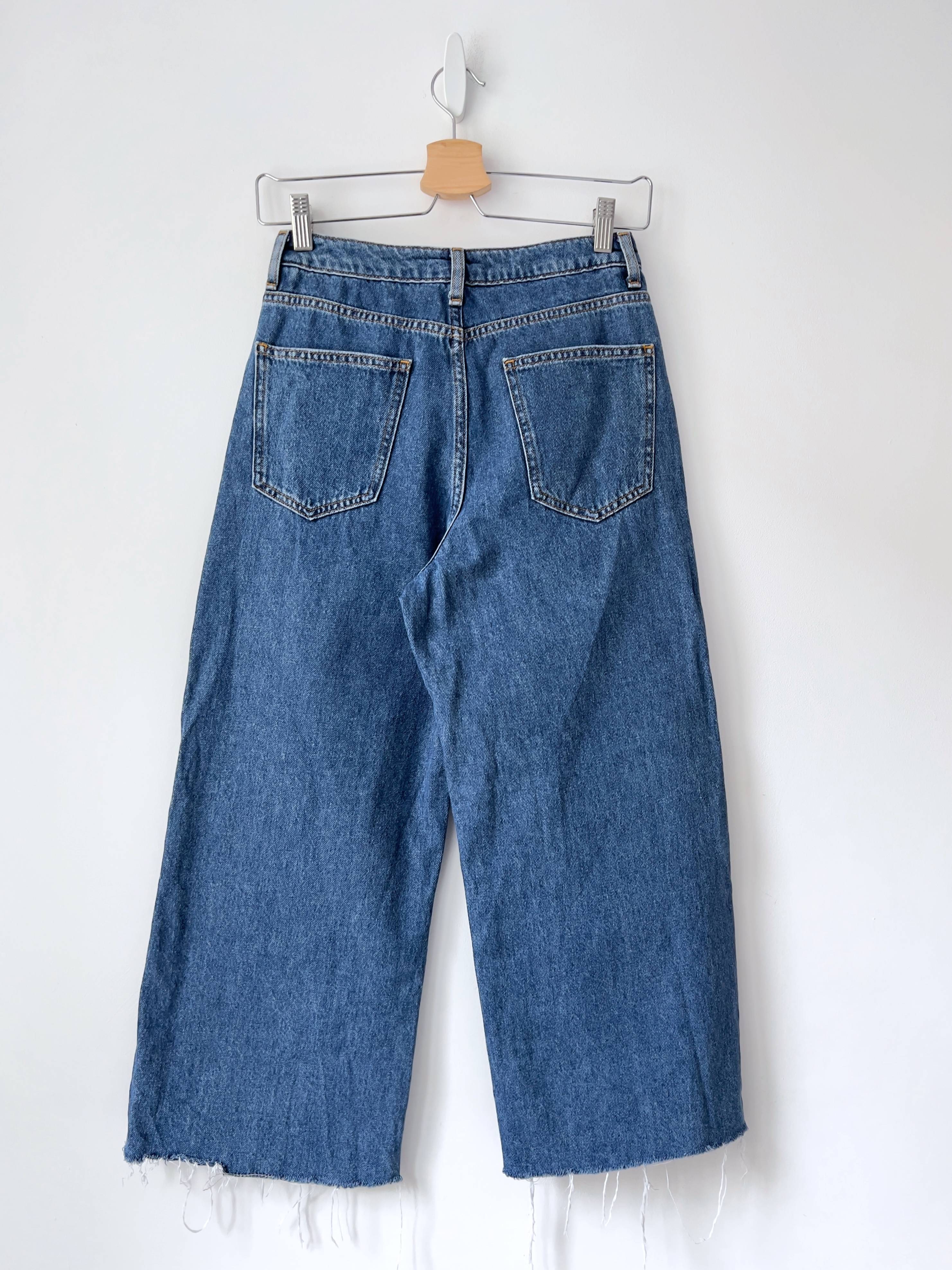 Jeansowe spodnie culotte. Wysoki stan, nogawka wykończona na surowo. Polecam na XS-S, bez wad.