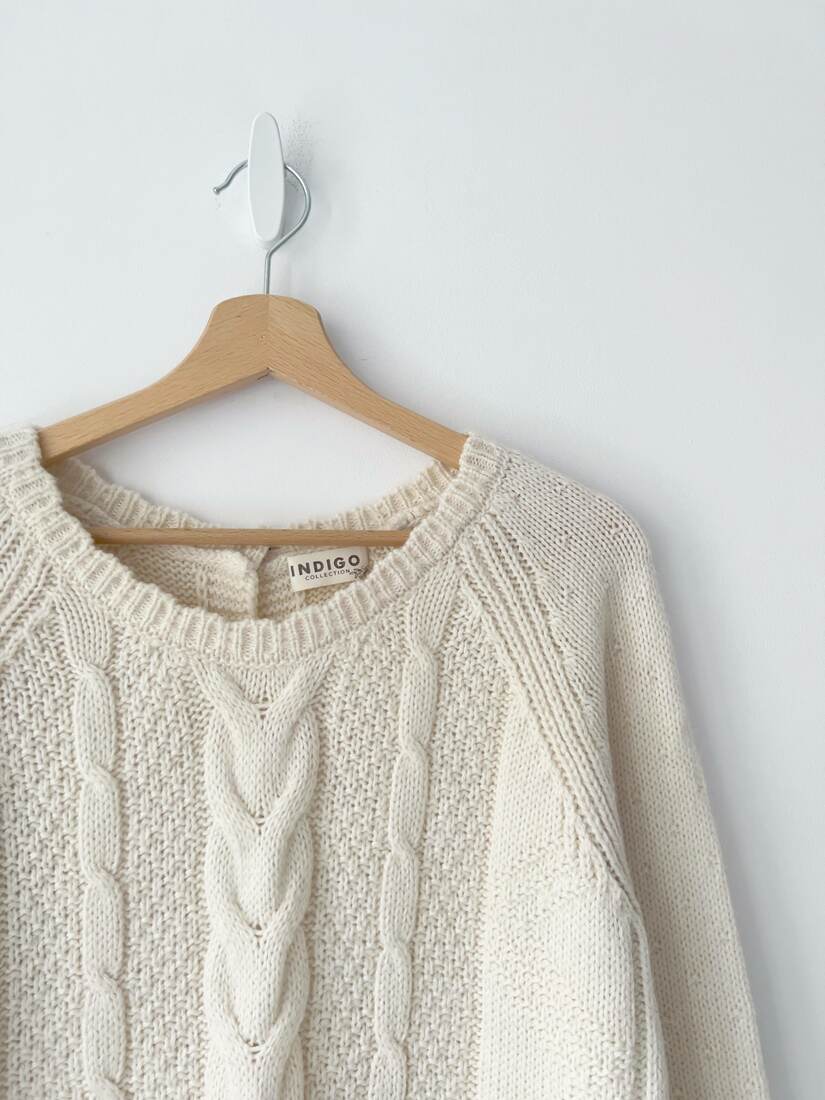 Sweter z guzikami na plecach. Wykonany z tkaniny z dodatkiem wełny. Rozmiar z metki M, dość uniwersalny. Bez wad. Skład: 30% wełna, 70% akryl
