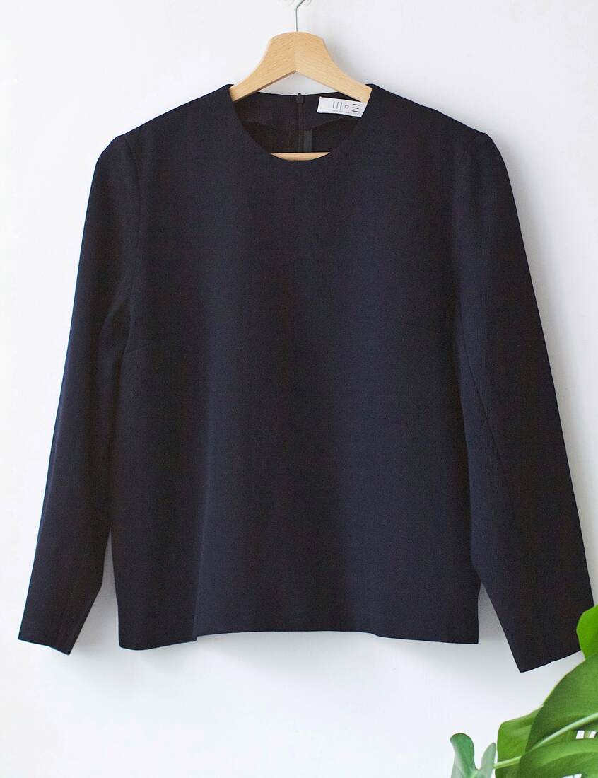 Granatowa bluzka w prążki o pudełkowym kroju. Skandynawska marka Moe Oslo. Materiał to wełna (70%) z dodatkiem poliamidu (30%), bardzo dobry stan.