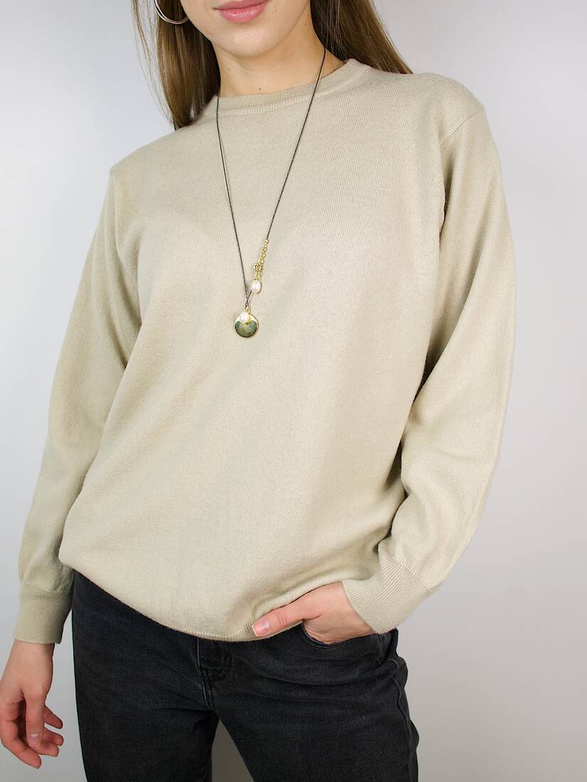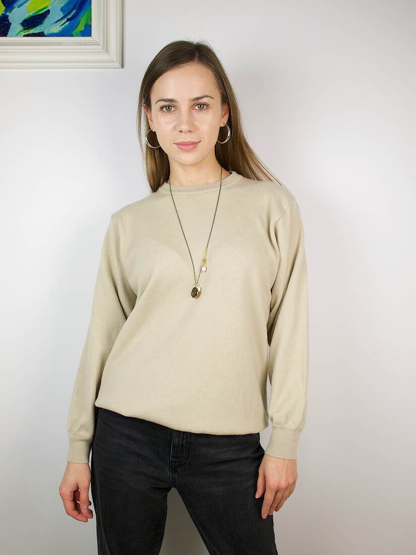 Beżowy sweter marki Marks&Spencer wyprodukowany we Włoszech. W składzie 50% wełny. Rozmiar z metki L, bez wad.