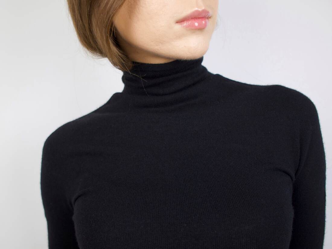 Dopasowany wełniany golf. Brak metek ze składem, jest to wełna, możliwie z dodatkiem elastanu. Polecam na XS, bez wad.