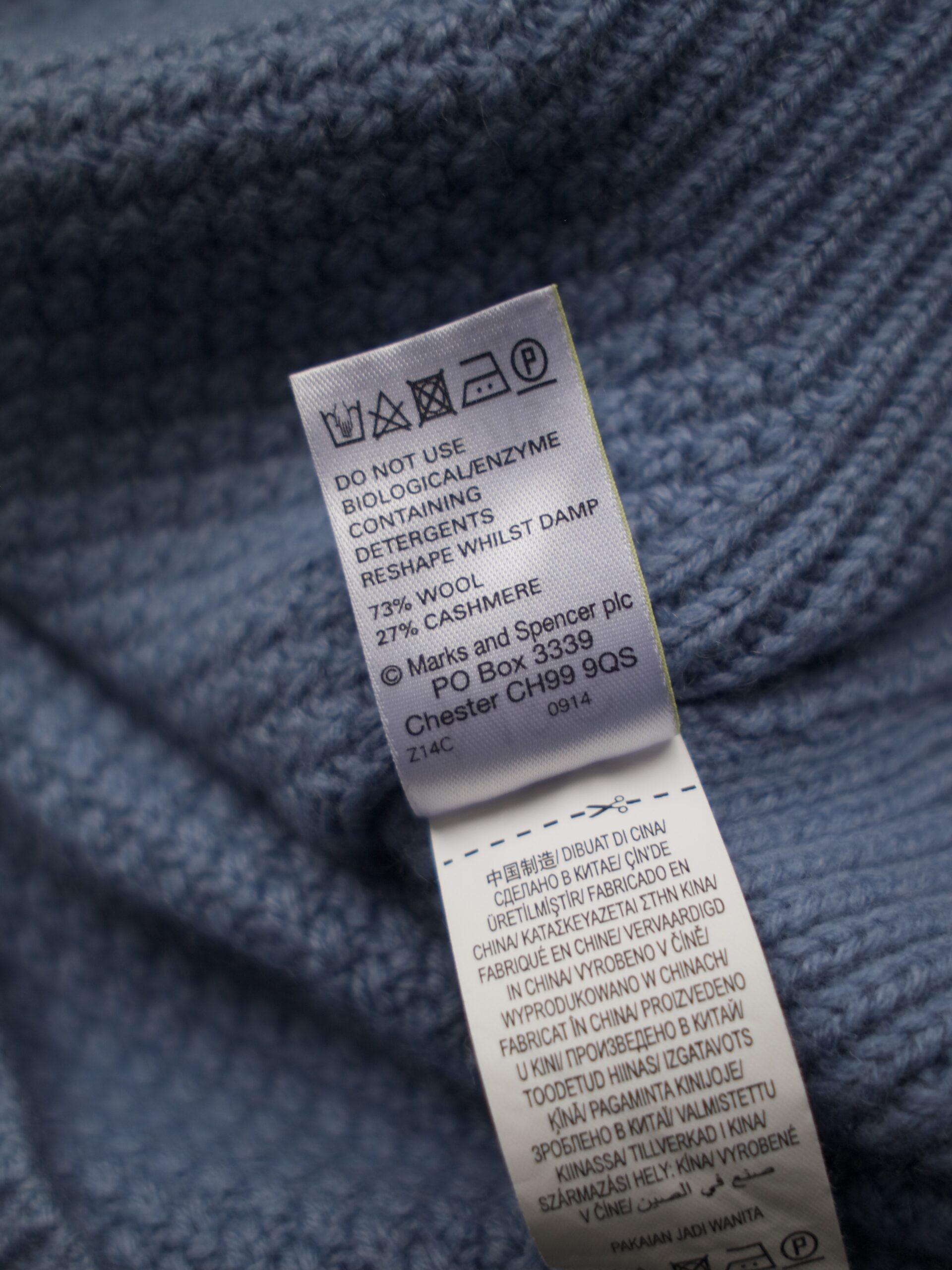Klasyczny sweter M&S z dekoltem w serek. Skład to 100% kaszmir, bardzo dobry stan, jest minimalnie sfilcowany, nie jest to zauważalne, po prostu jest trochę sztywniejszy.