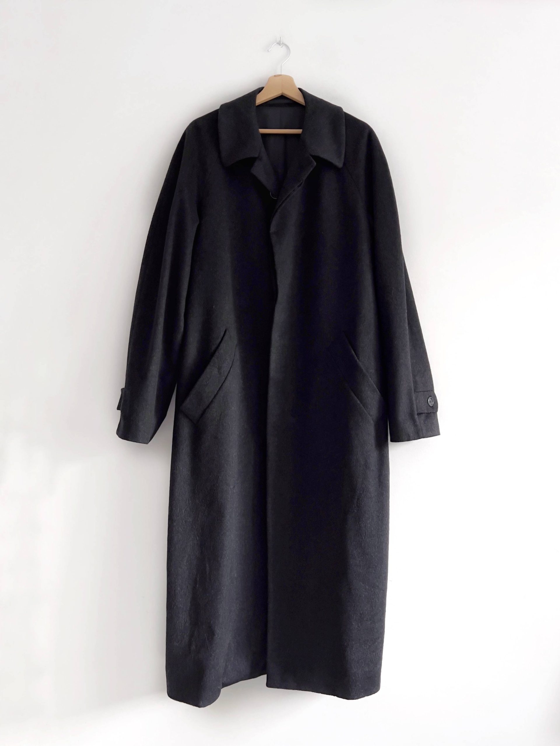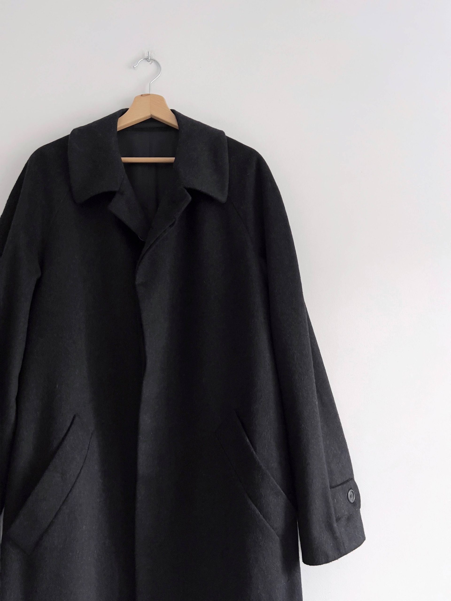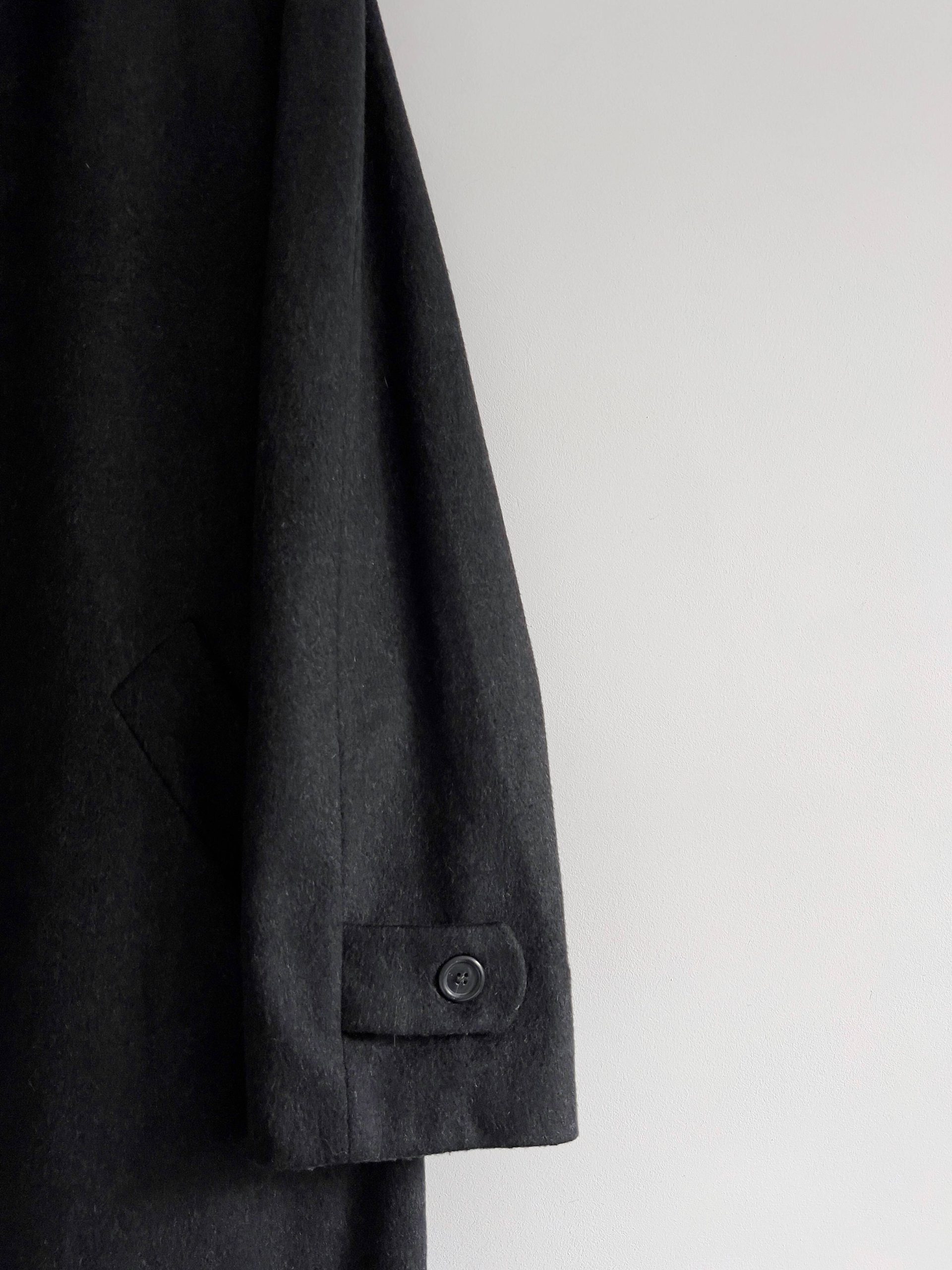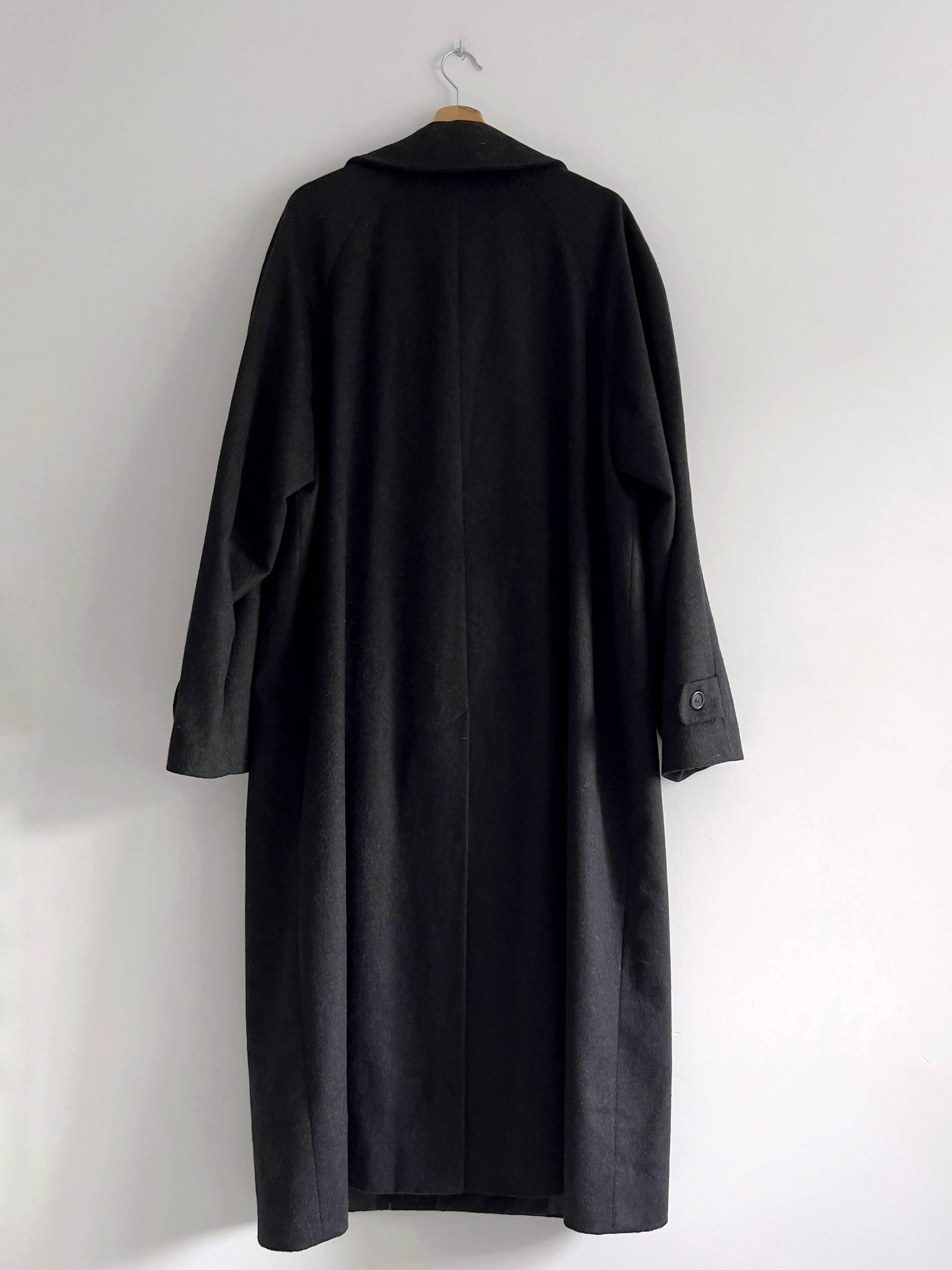 Płaszcz o prostym fasonie, bez zaznaczonej linii ramion. Wykonany z miękkiej tkaniny zawierającej wełnę i kaszmir, bardzo miły w dotyku. Polecam na L lub jako oversize. Bez wad.