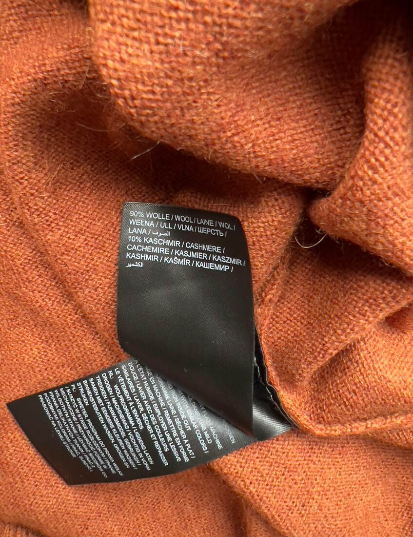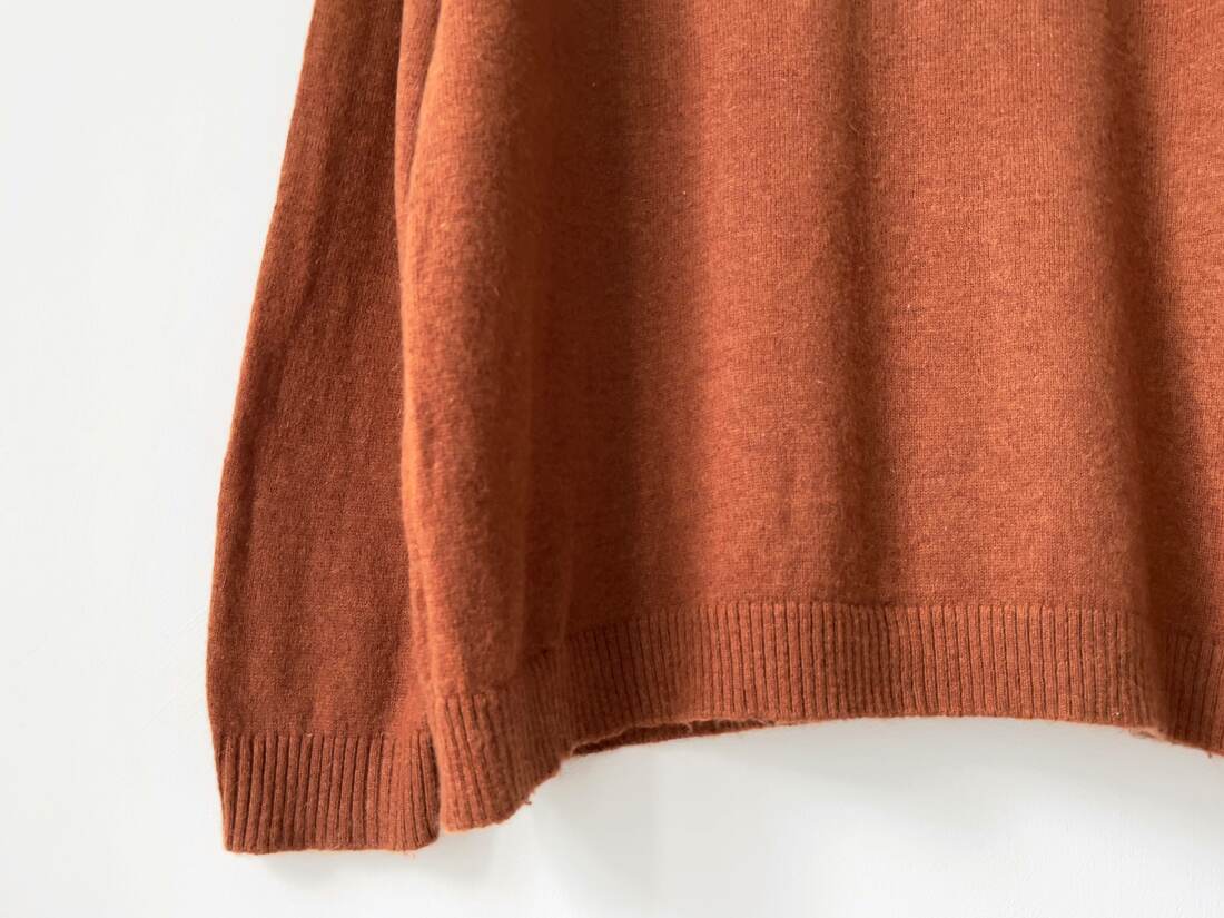 Bardzo miły w dotyku sweter, wykonany z wełny z dodatkiem kaszmiru. Polecam na XL lub jako overszie. Bez wad. Skład: 90% wełna, 10% kaszmir