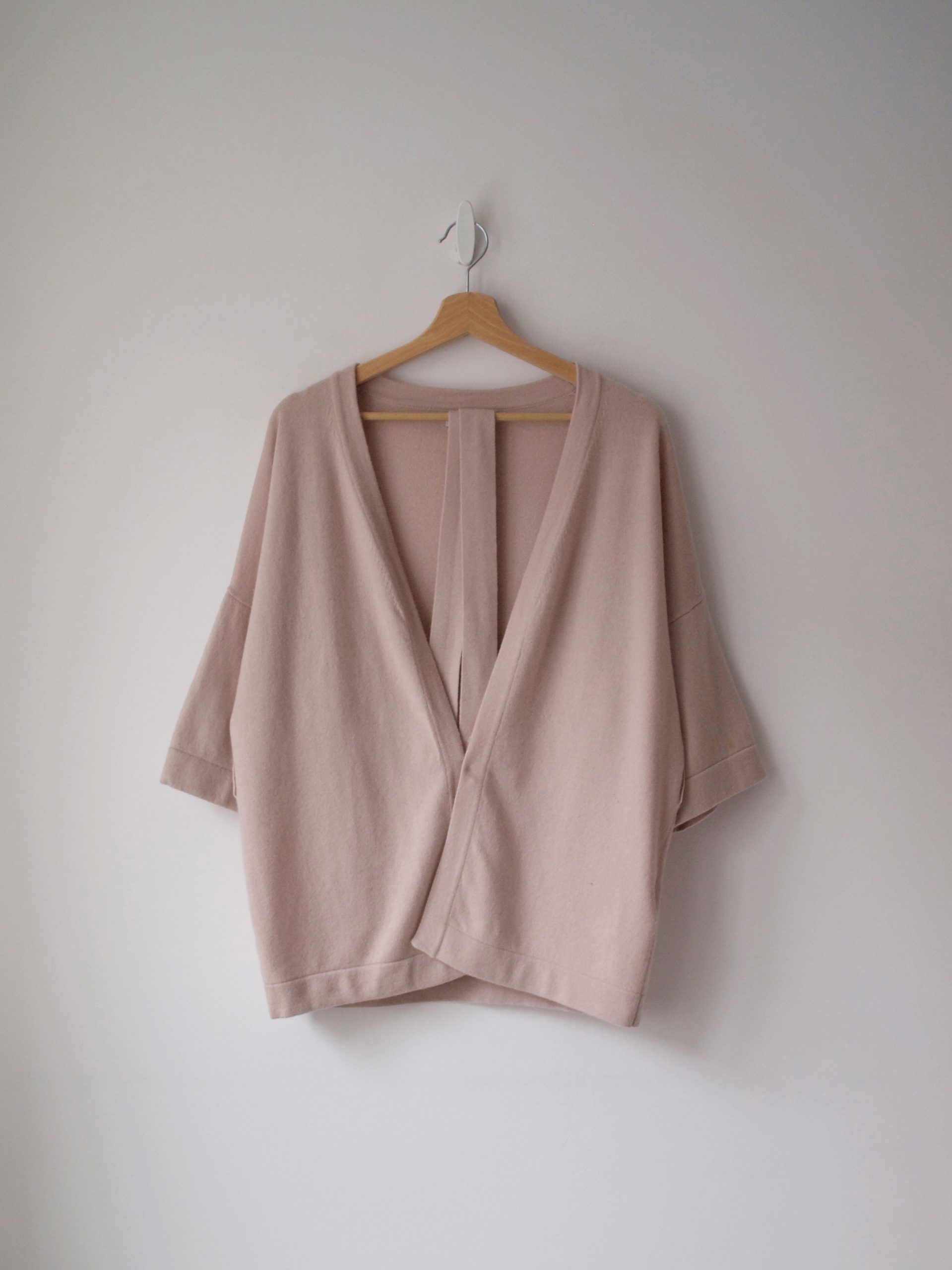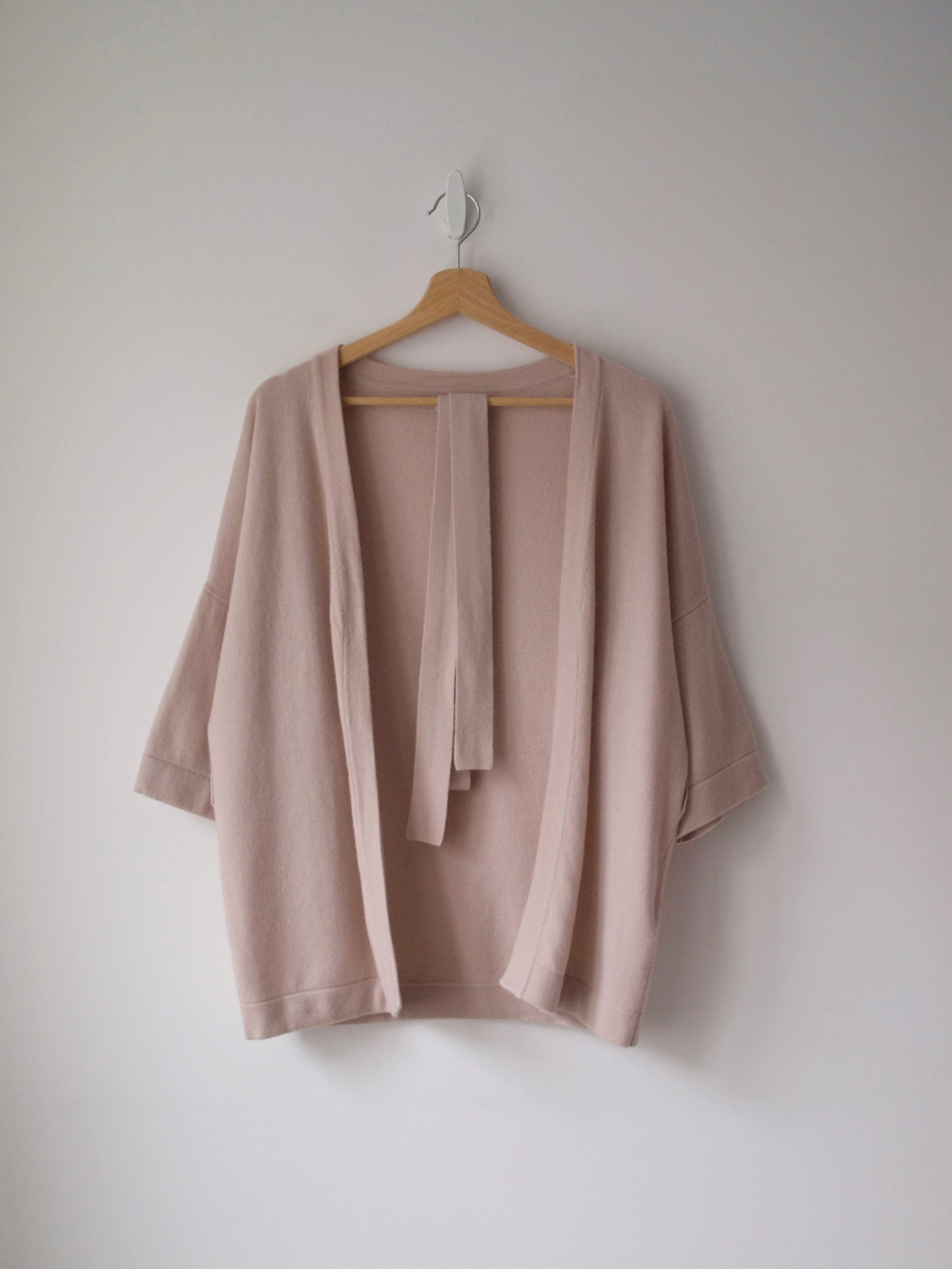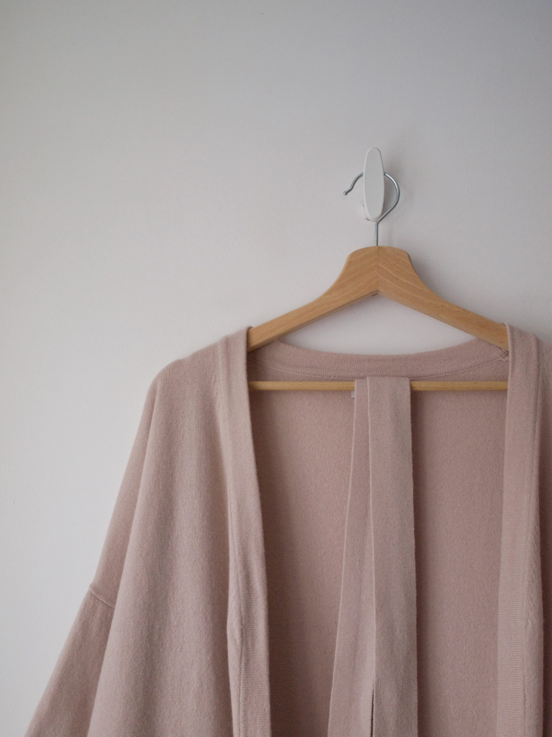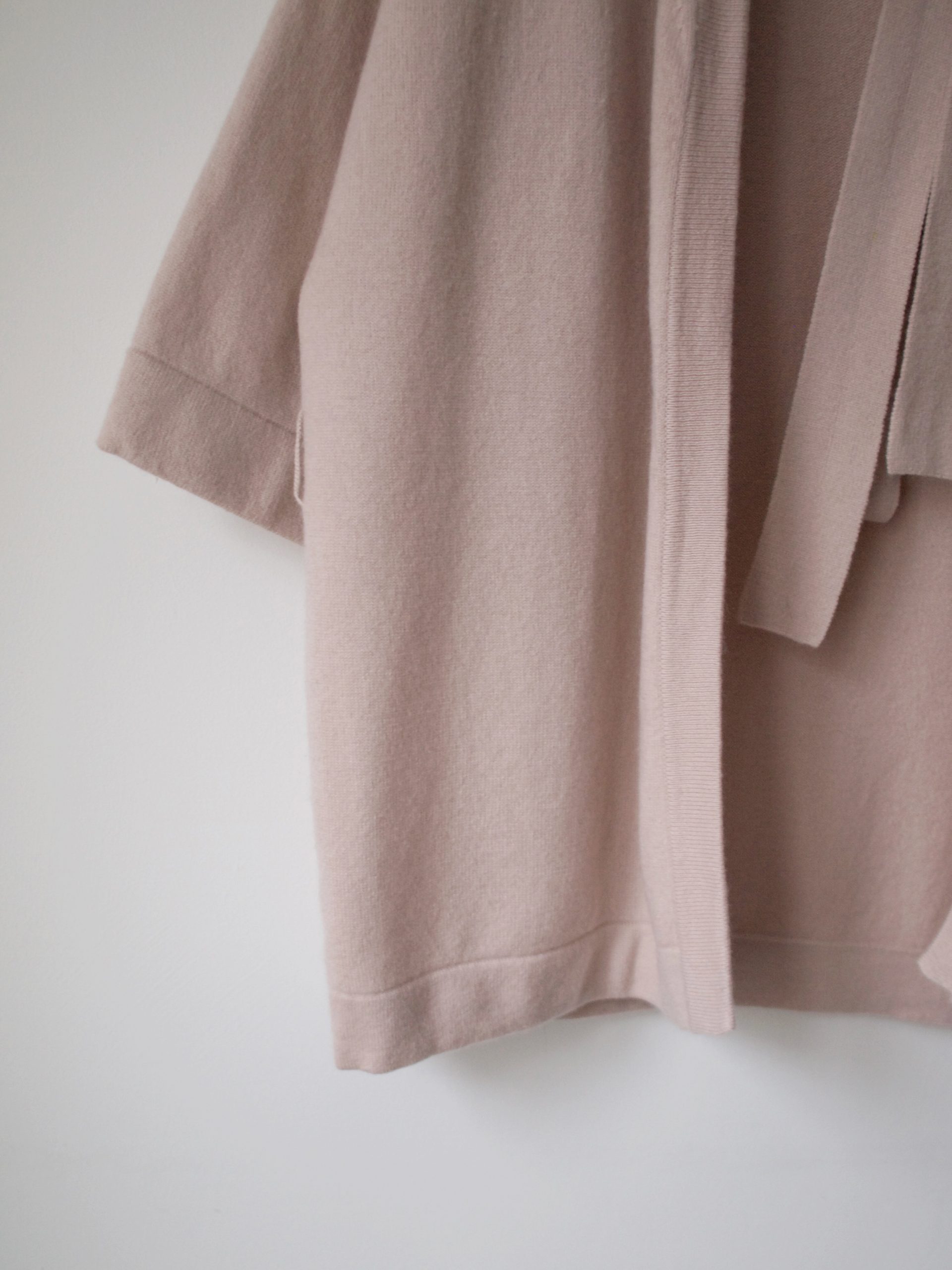 Sweter-narzuta w kolorze pudrowego różu, z szerokimi kimonowymi rękawami oraz paskiem. Wykonany z miłej w dotyku mieszanki wełny oraz kaszmiru.