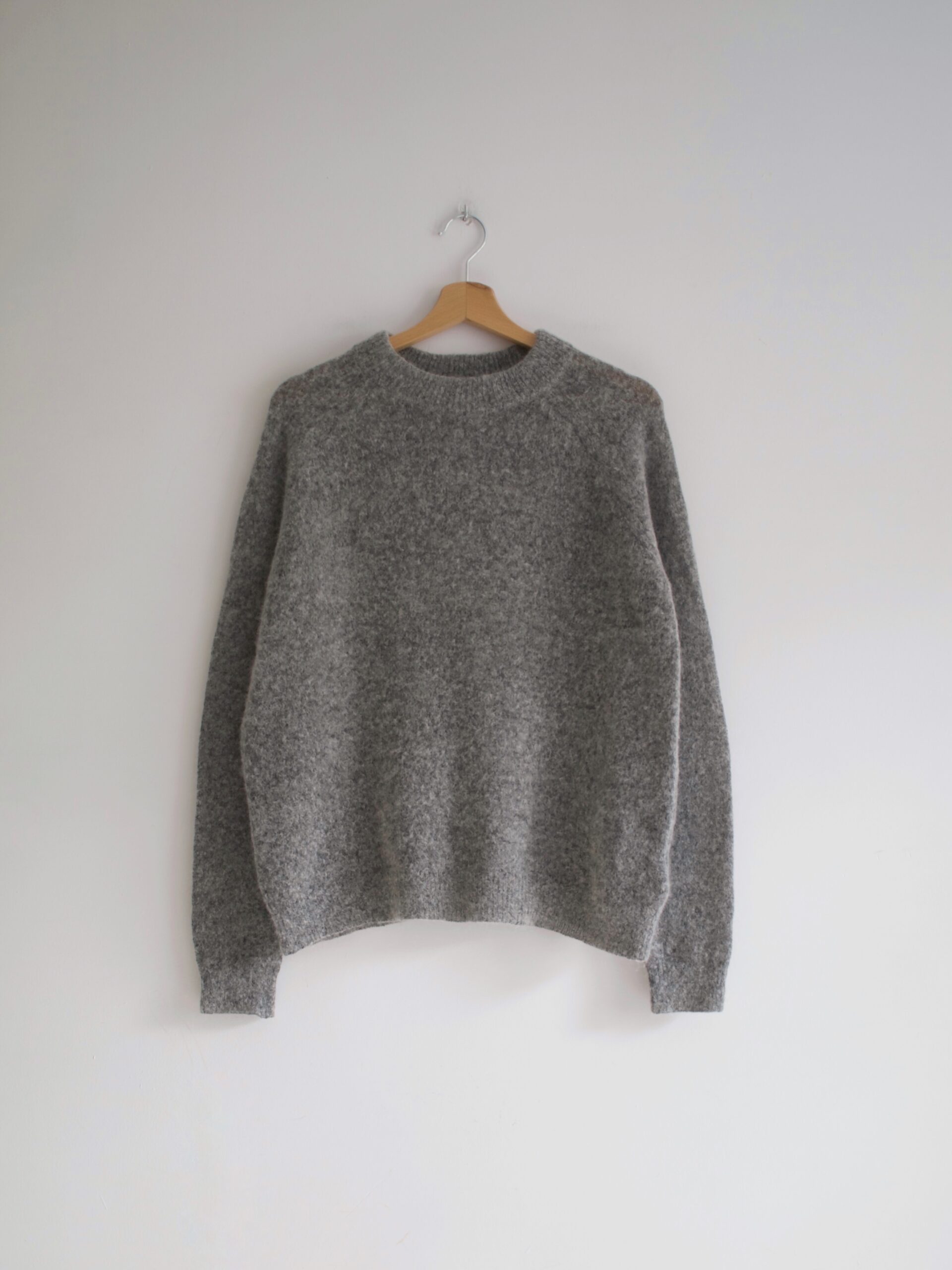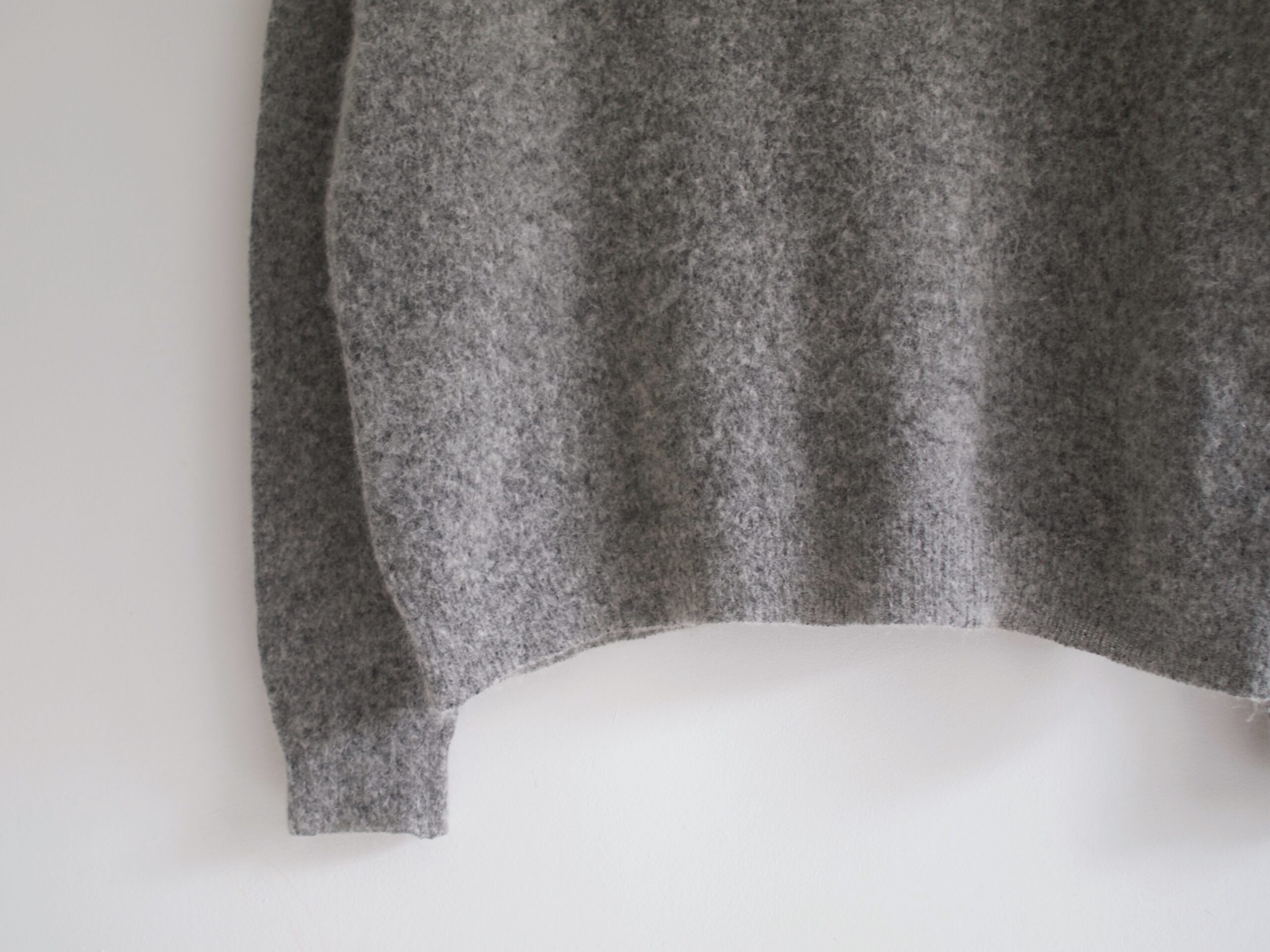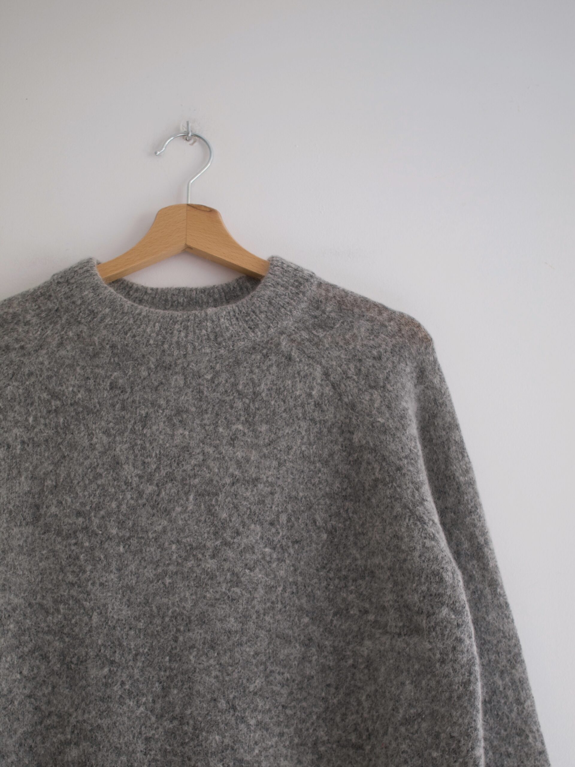 Sweter o luźnym kroju, wykonany z materiału z dużym dodatkiem wełny oraz moheru. Może gryźć.