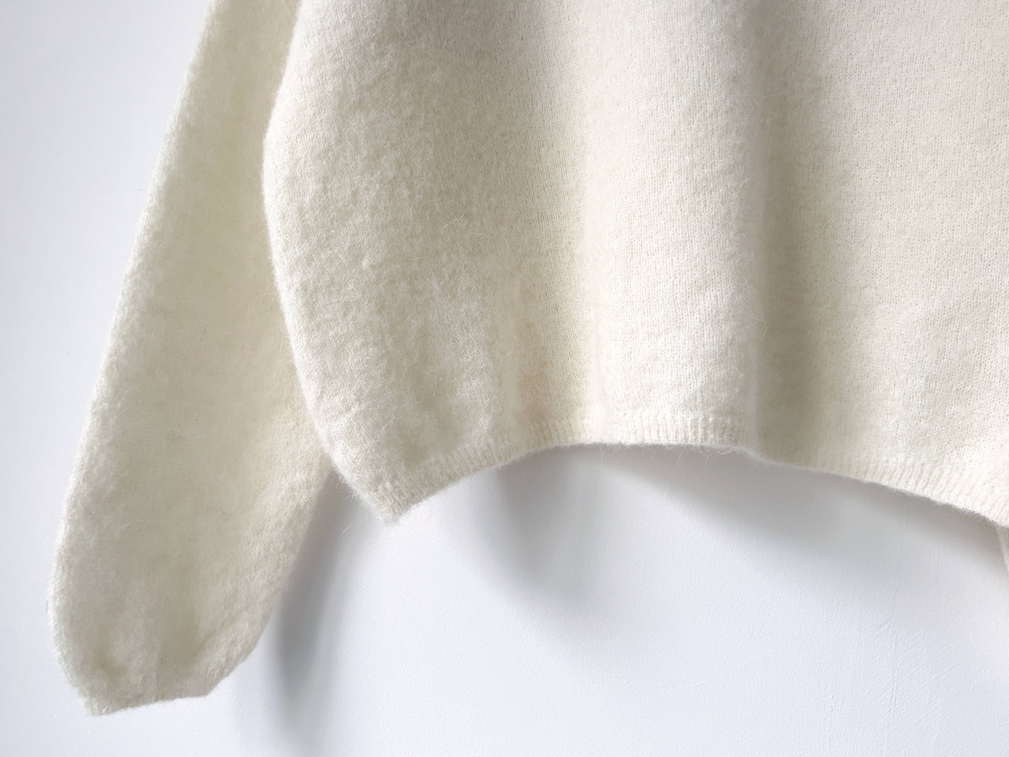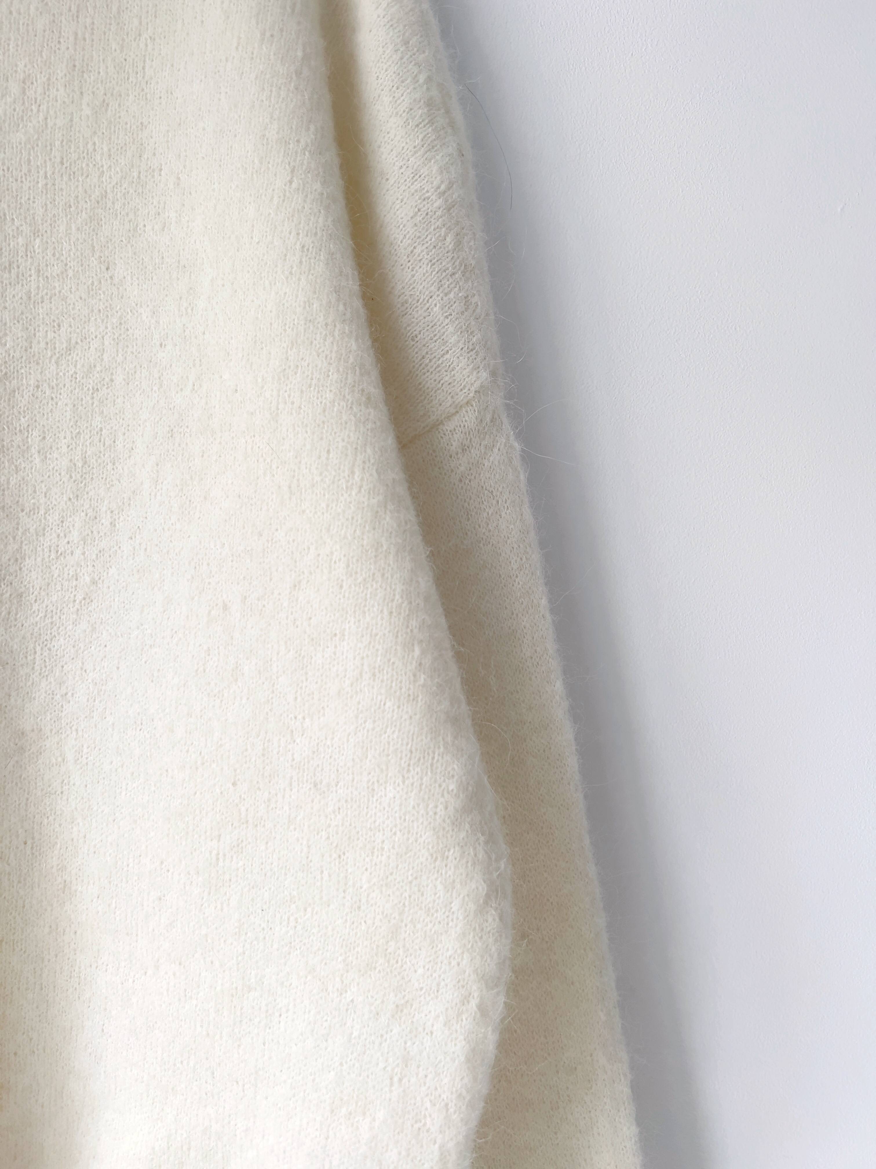 Puszysty sweter o pudełkowym kroju. Brak metki ze składem, prawdopodobnie jest to mieszanka moheru oraz wełny. Ze względu na fason polecam jako one size. Bez wad.