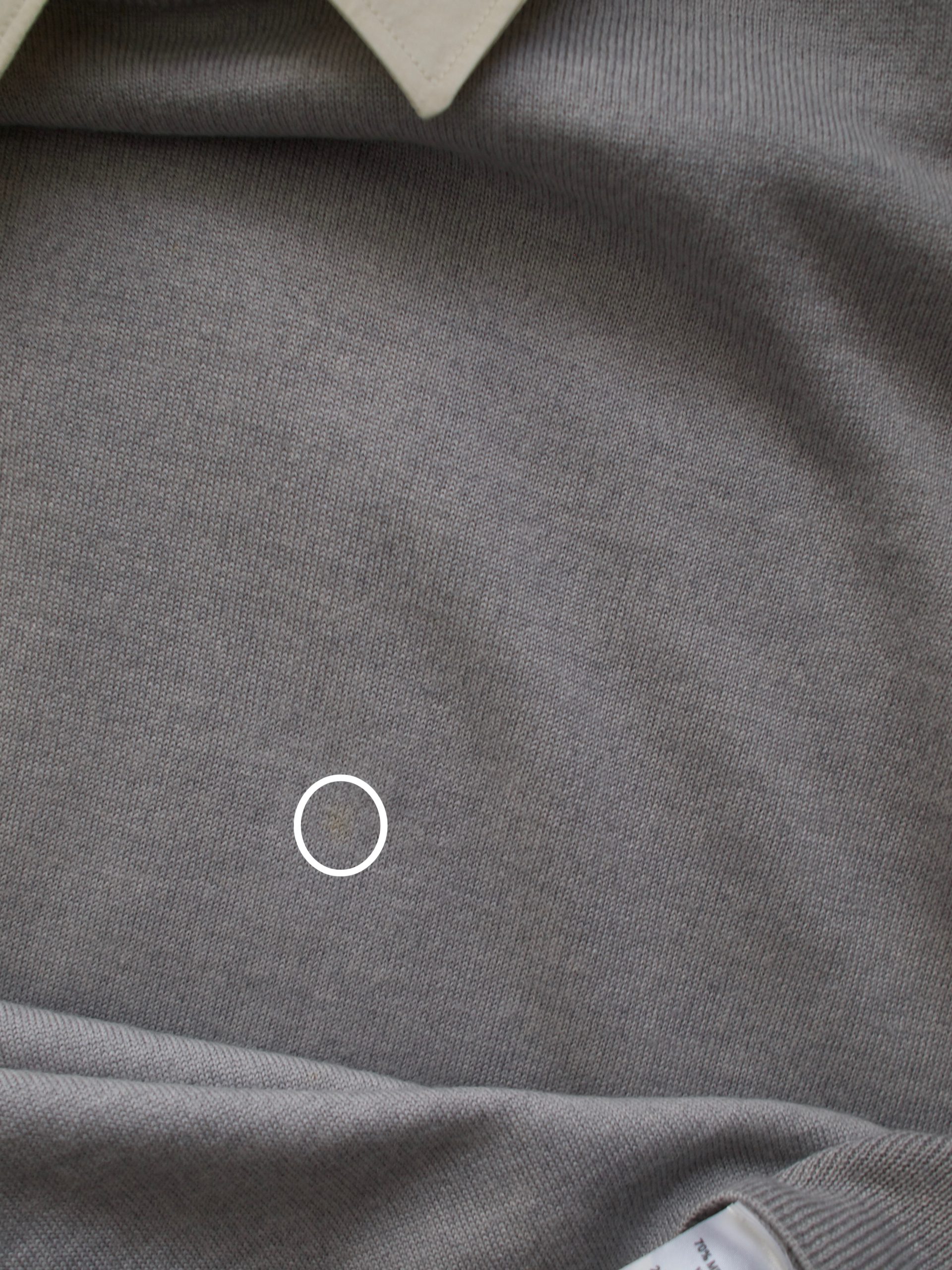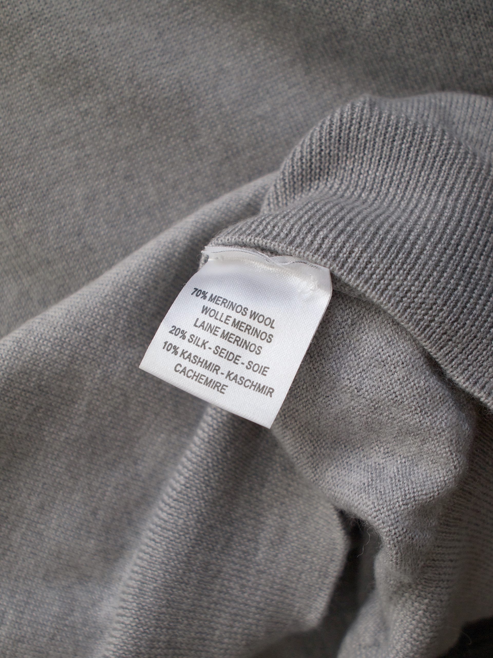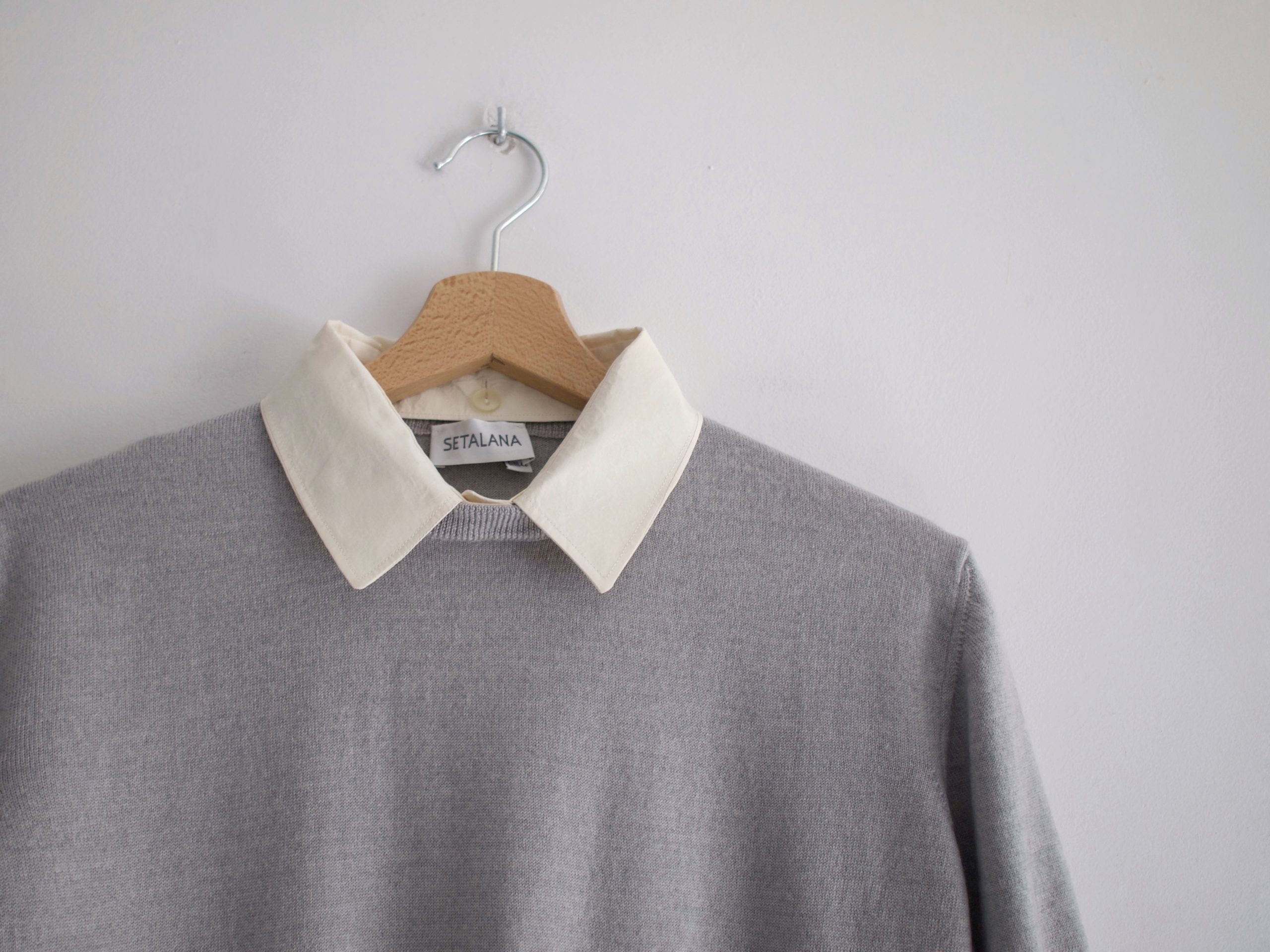 Sweter z odpinanym jedwabnym kołnierzem. Wykonany z miłej w dotyku mieszanki wełny merynosa, jedwabiu i kaszmiru. Będzie pasować na r.M. Ma malutką plamkę, jest zaznaczona na zdjęciu. Nie widoczna w noszeniu.