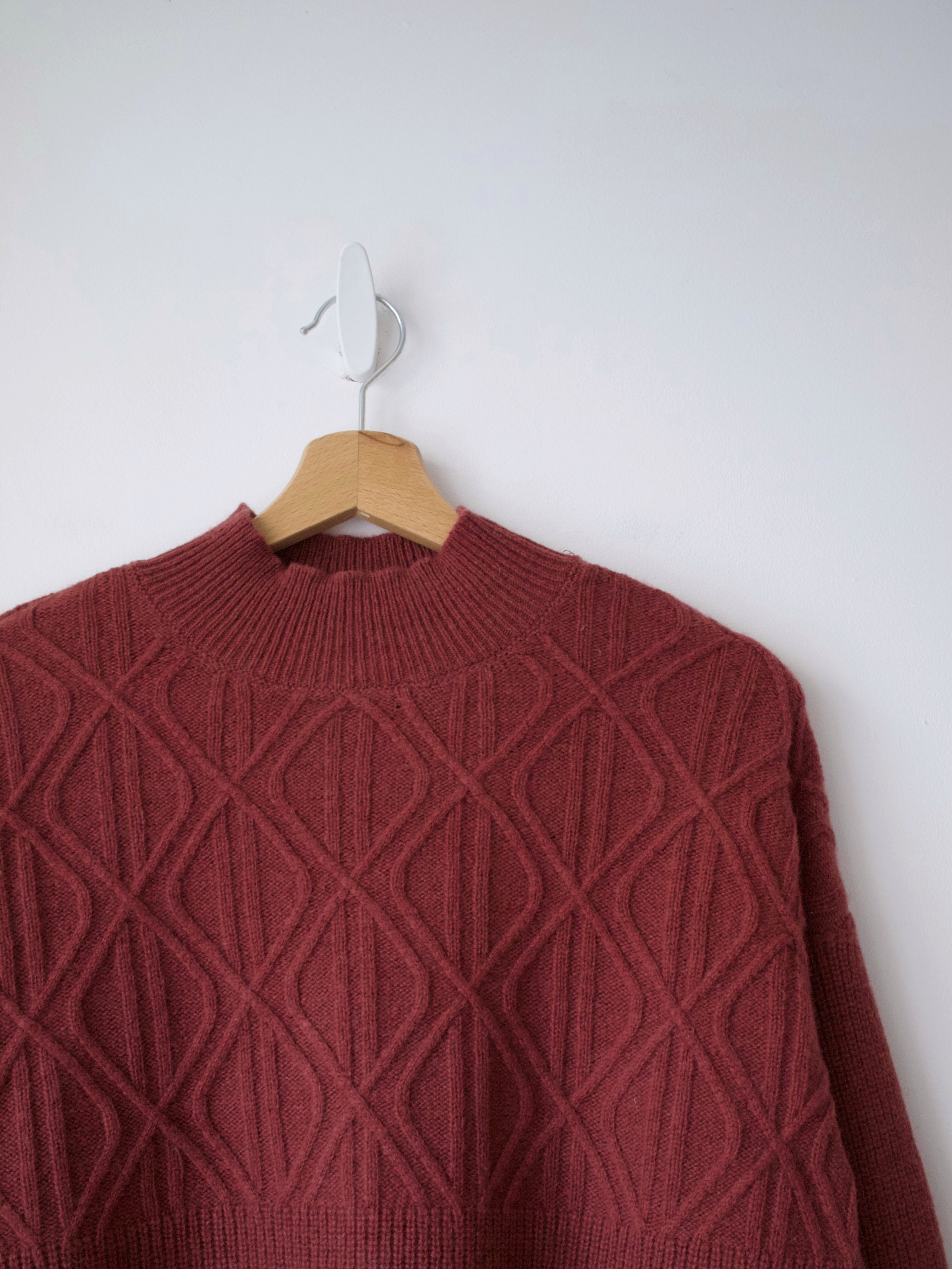 Minimalistyczny kaszmirowy sweter o pudełkowym kroju. Sweter bardzo miękki i przyjemny, ma dwie małe zacerowane dziurki, nie widoczne w noszeniu, poza tym brak mankamentów. Wymiary poniżej.