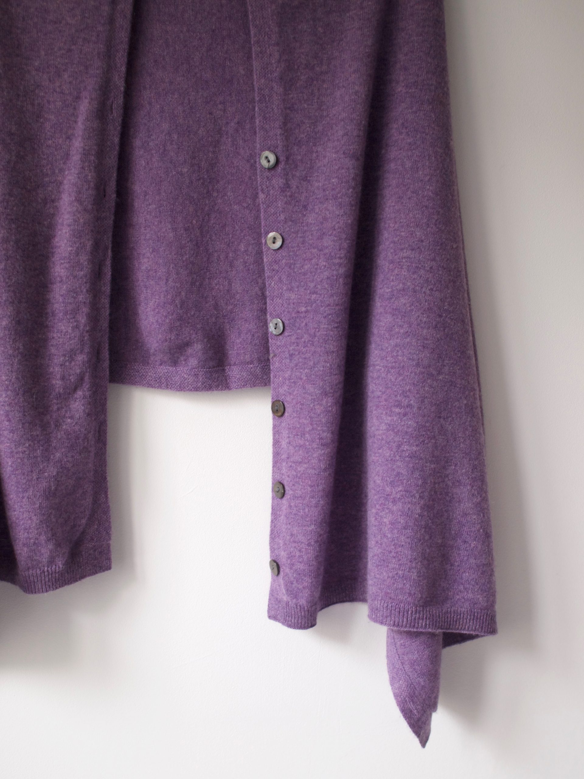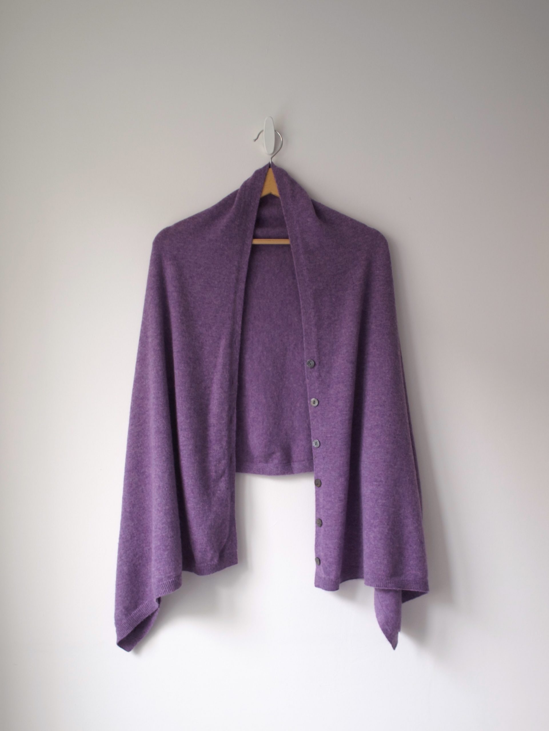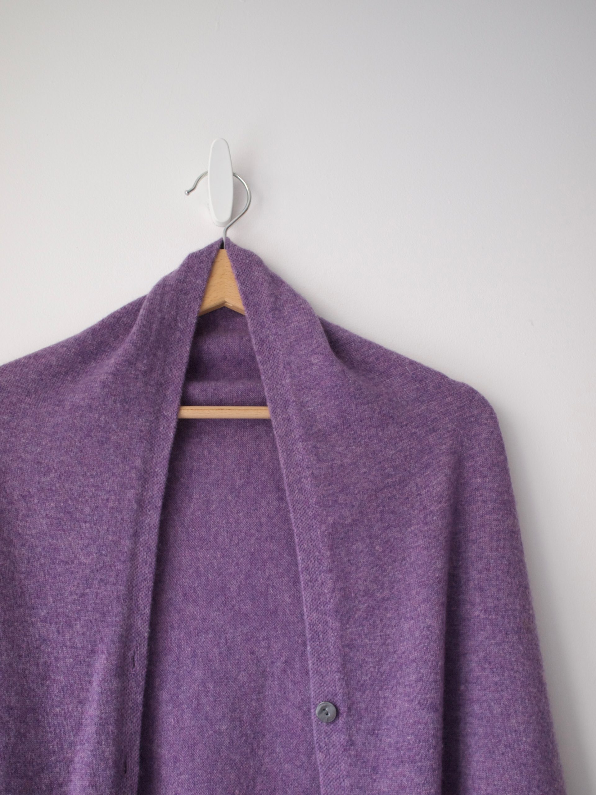 Duży, bardzo przyjemny w dotyku szal marki Woolovers. Dzięki guzikom może być noszony jako narzutka lub ponczo. Skład: 80/20% merino/kaszmir Stan: idealny Szerokość 61cm Długość 160 cm