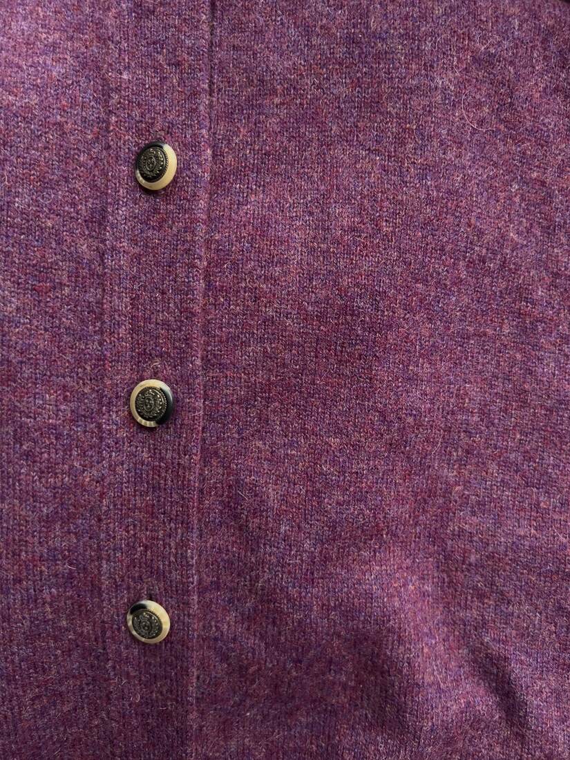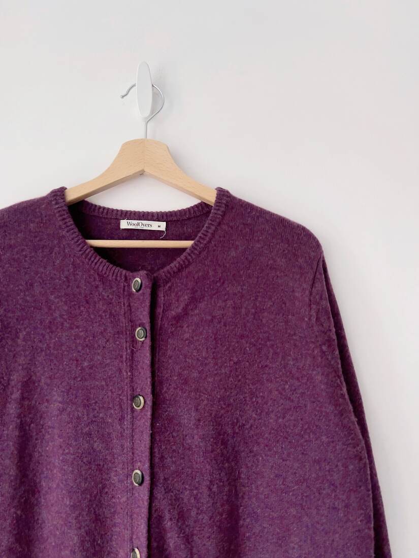 Kardigan w śliwkowym kolorze, brytyjska marka WoolOvers. W 100% wykonany z wełny. Rozmiar z metki M, dość luźny fason. Bardzo dobry stan.