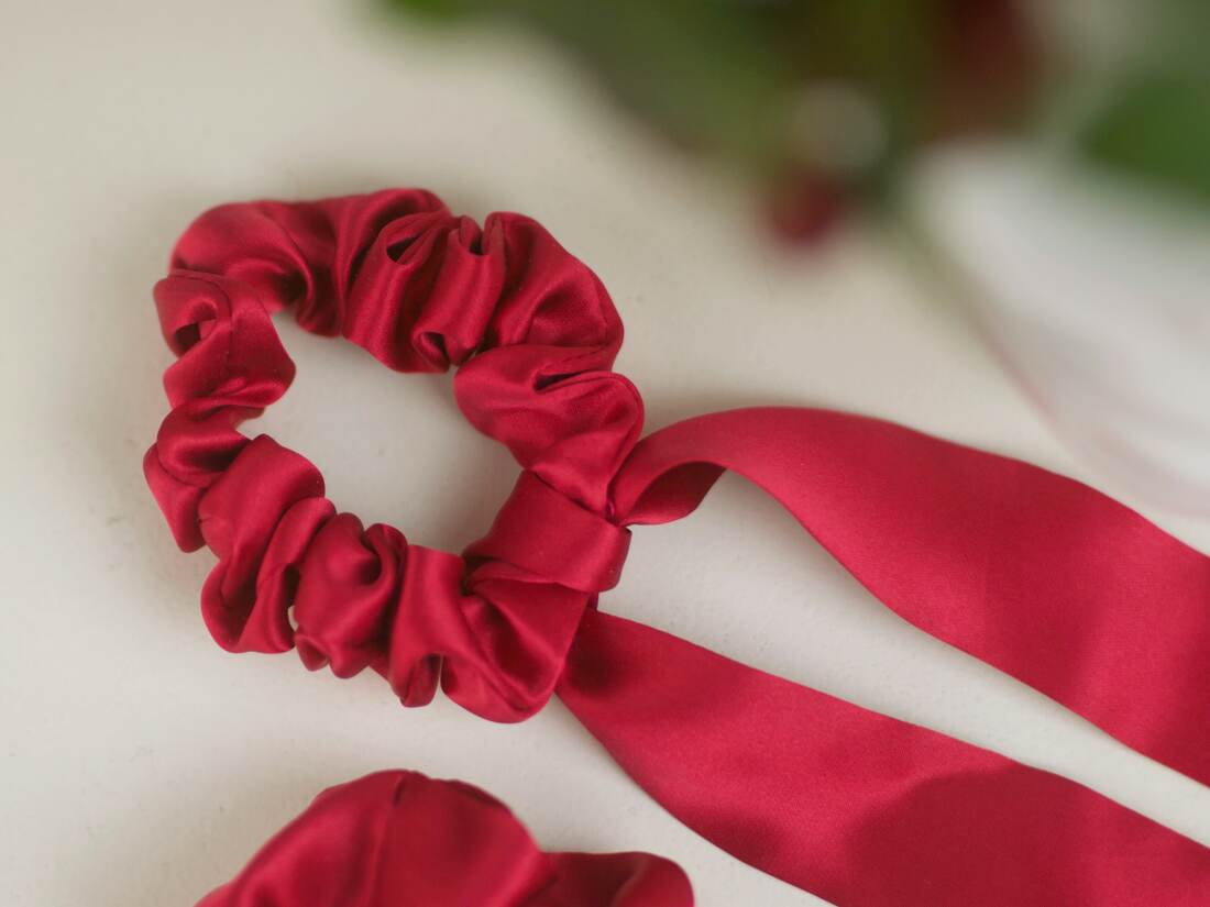 Zestaw dwóch jedwabnych gumek do włosów szyty z jedwabiu z recyklingu. Wstążkę można wiązać na dowolną gumkę.