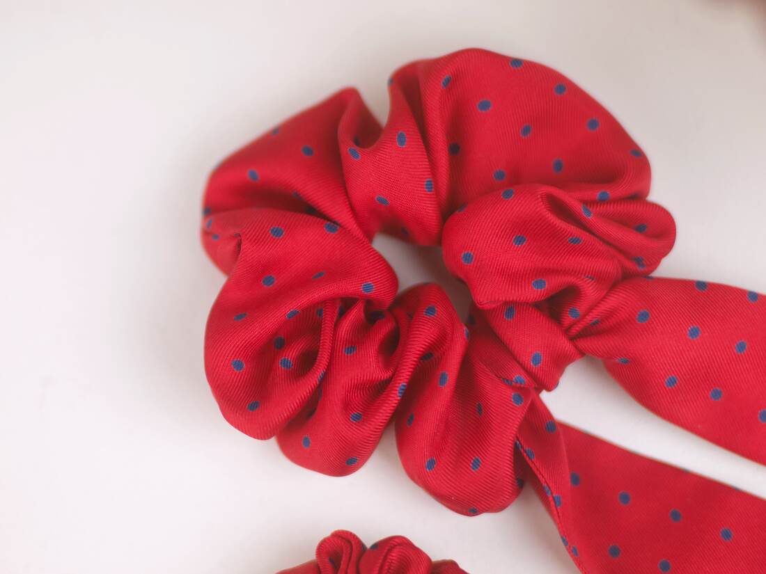 Zestaw dwóch jedwabnych gumek do włosów szyty z jedwabiu z recyklingu. Wstążkę można wiązać na dowolną gumkę.