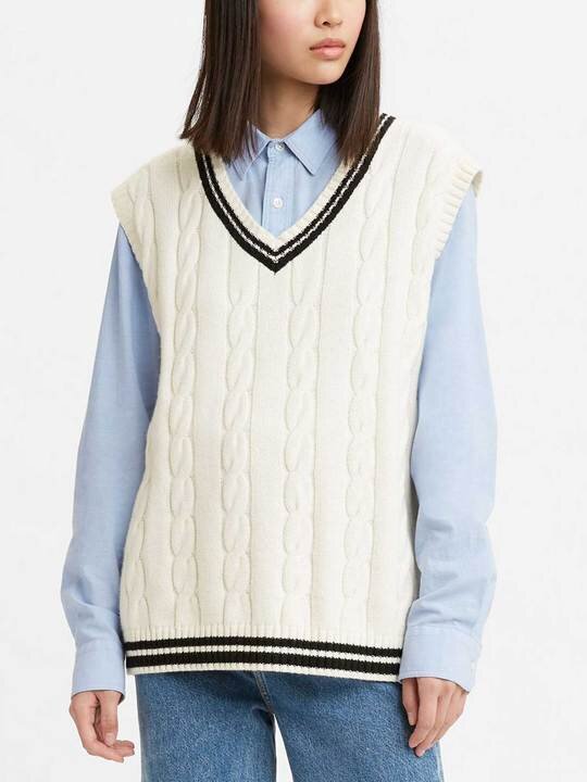Bezrękawnik marki Levis, model Agi Sweater Vest. Rozmiar z metki: L, bardzo luźny Skład: 45% poliamid, 30% bawełna, 25% wełna Stan: bez wad Szerokość w klatce 55 cm Długośćcałkowita 71 cm