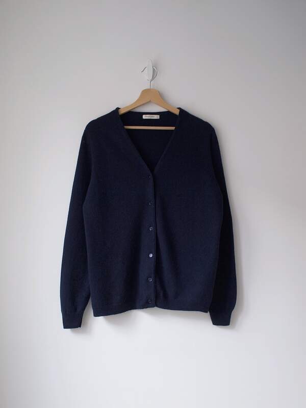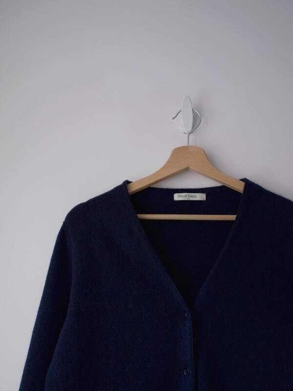 Kardigan angielskiej marki W0olOvers. Wykonany z wełny merino z dodatkiem kaszmiru, bardzo miękki i puszysty. Kolor granatowy. Rozmiar z metki: L Skład: 80% wełna merino, 20% kaszmir Stan: bez wad Szerokość w klatce 54 cm Długośćcałkowita 65 cm