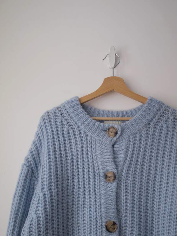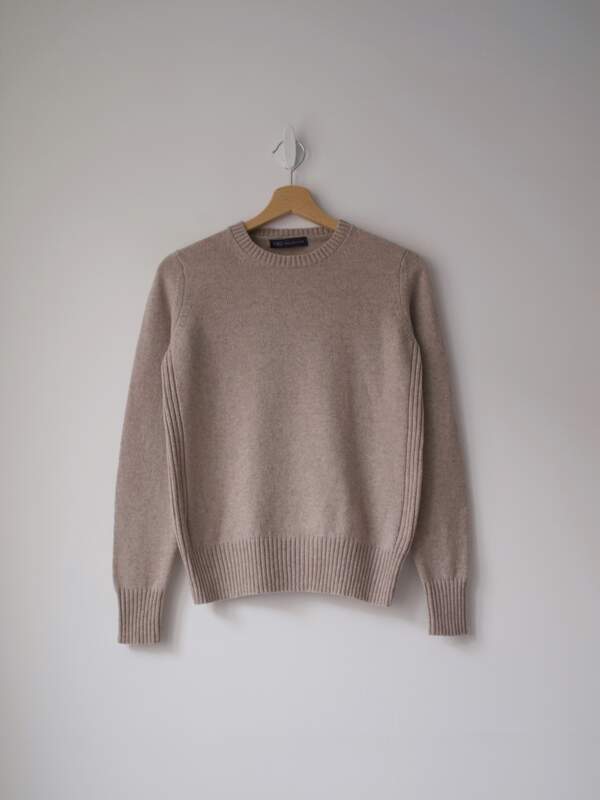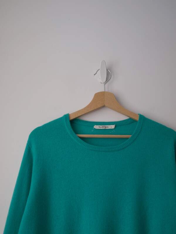 Bardzo miły w dotyku sweter brytyjskiej marki WoolOvers. Kolor turkusowy. Rozmiar z metki: L Skład: 80% wełna merino, 20% kaszmir Stan: bardzo dobry Szerokość w klatce 55 cm Długośćcałkowita 68 cm