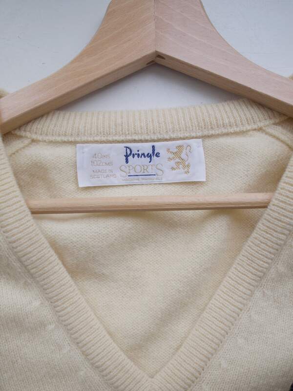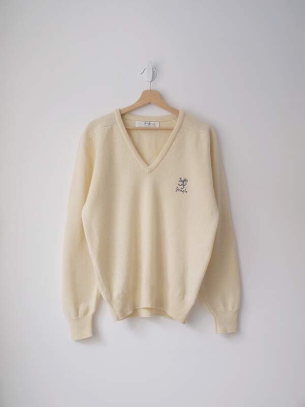 Sweter ekskluzywnej marki Pringle of Scotland, model vintage z lat 80. Kolor to pastelowy żółty. Rozmiar z metki: 40 Skład: wełna Stan: idealny Szerokość w klatce 52 cm Długośćcałkowita 66 cm