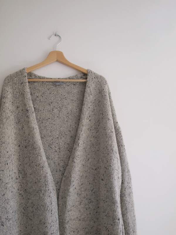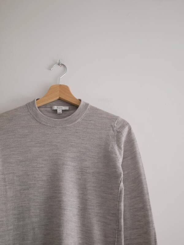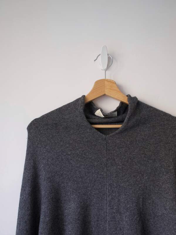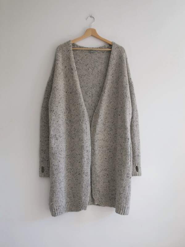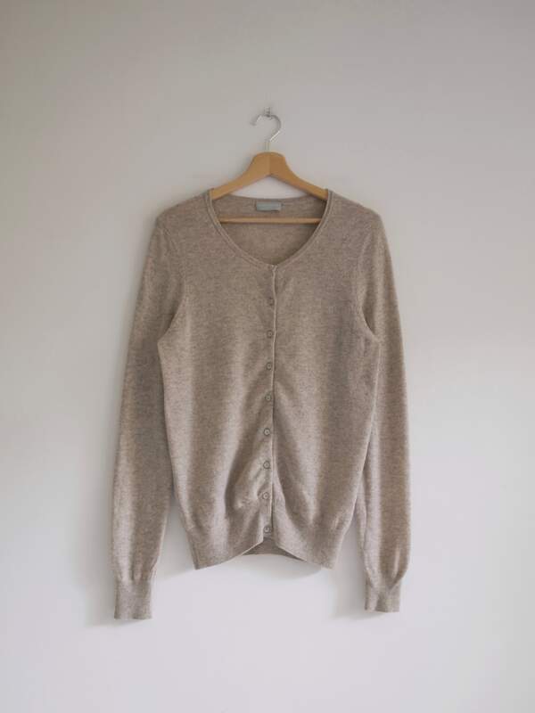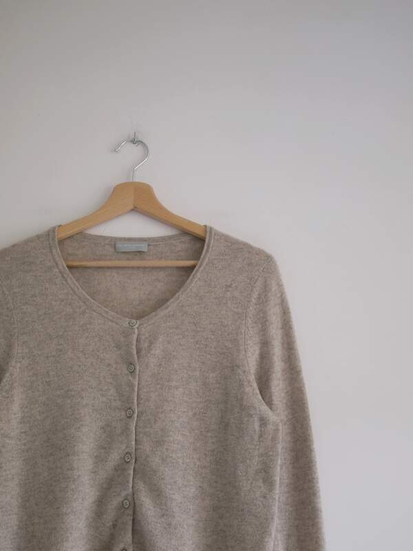 90,00 złKardigan w kolorze szarobeżowego melanżu, angielska marka The White Company. W 100% wykonany z kaszmiru, bardzo miękki i miły w dotyku. Ma parę cerowań, gubią się w melanżu i są absolutnie nie widoczne.