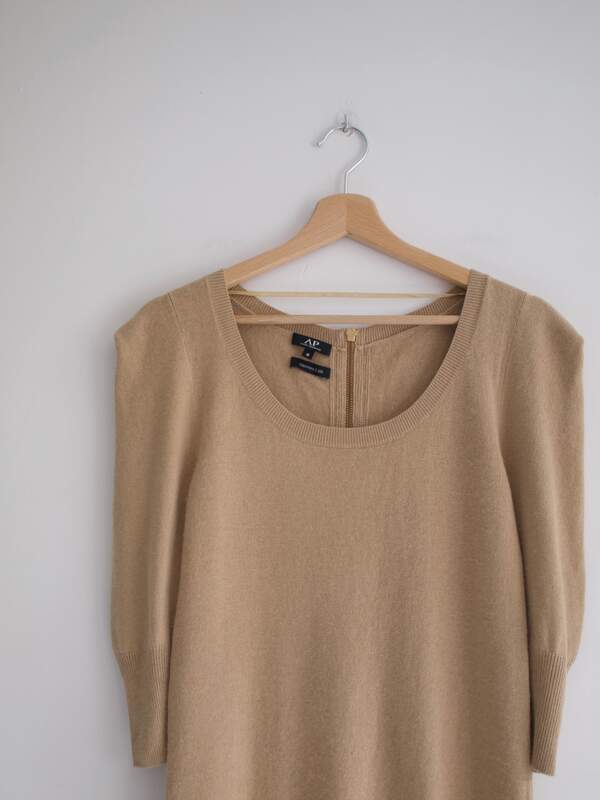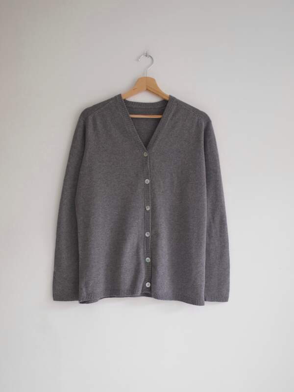 Cienki kaszmirowy kardigan. Przy dekolcie na plecach ma małe cerowanie, absolutnie nie widoczne w noszeniu (na zdjęciach). Poza tym bez wad. Rozmiar: brak metki Skład: 100% kaszmir Stan: bardzo dobry – Szerokość w klatce 50 cm Długośćcałkowita 66 cm