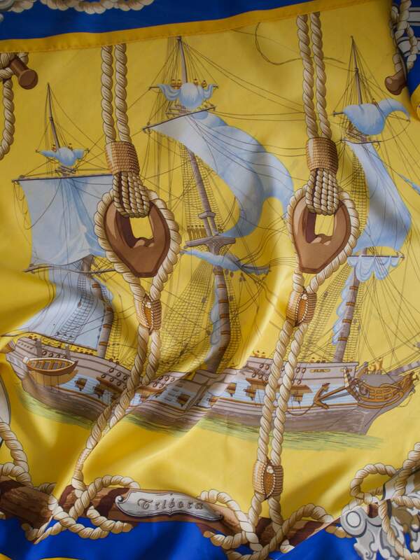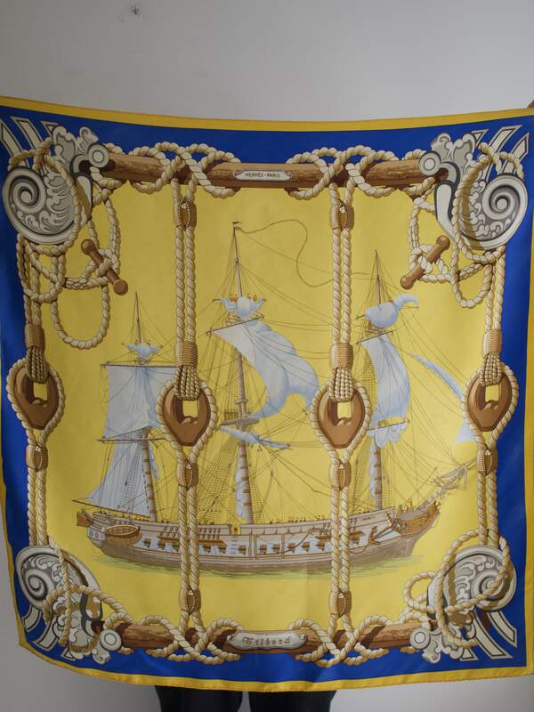 400,00 złDuża jedwabna chusta Carré domu mody Hermès. Model „Tribord” autorstwa Julia Abadie, pierwsza edycja pojawiła się w 1968 roku. W górnej środkowej części oraz na dole obok nazwy jest logo marki, w dolnym prawym rogu imię autorki ukryte we wzorach. Materiał to gruby jedwab twill, chusta jest ręcznie rolowana. Brak metki ze składem. Chusta w niektórych miejscach posiada zacieki oraz rysy, prawdopodobnie powstałe w skutek nieodpowiedniego prania. Są pokazane na zdjęciach. Nie są widoczne w noszeniu na szyi. Poza tym bardzo dobry stan, kolory są nasycone, a materiał bez dziur, przetarć czy zaciągnięć.