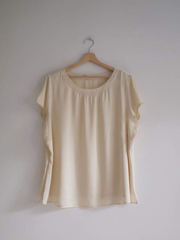 Rozmiar: 36, bardzo luźny Skład: 100% jedwab Stan: bez wad Szerokość w klatce 52 cm Długość całkowita 67 cm