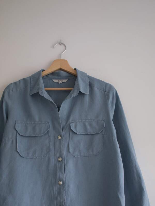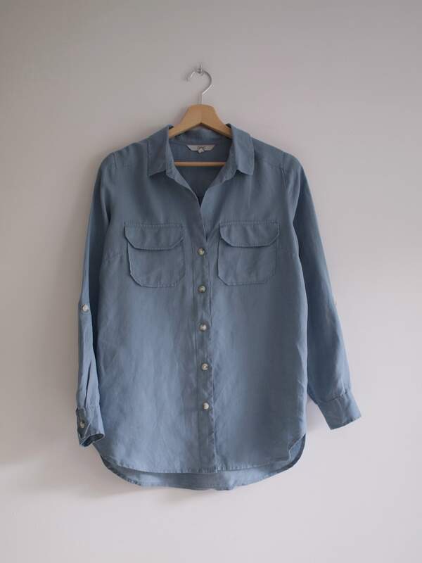 Lniana koszula w kolorze gołębim. Rozmiar: 8 Skład: 100% len Stan: idealny Szerokość w klatce 51 cm Długość całkowita 73 cm