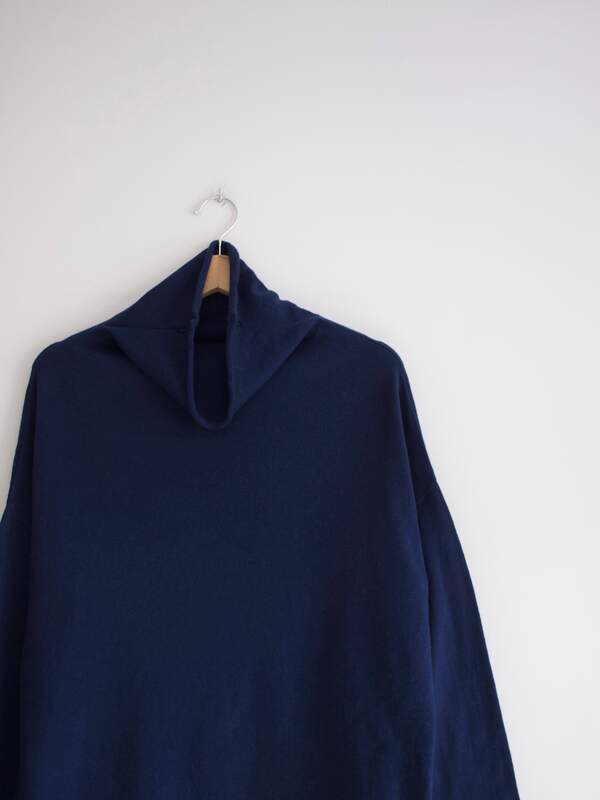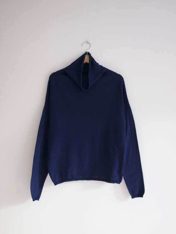 Granatowy sweter z kołnierzem stójką. Niemiecka marka Eve in Paradise, specjalizująca się w produkcji ubrań z naturalnych tkanin wysokiej jakości.