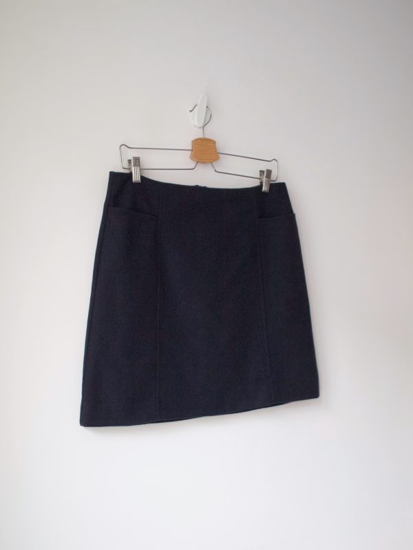 Granatowa, trapezowa spódnica marki Marc O’Polo, wykonana z wysokiej jakości wełny. Model z włoskiej tkaniny, zapinany na boczny zamek, z podszewką.