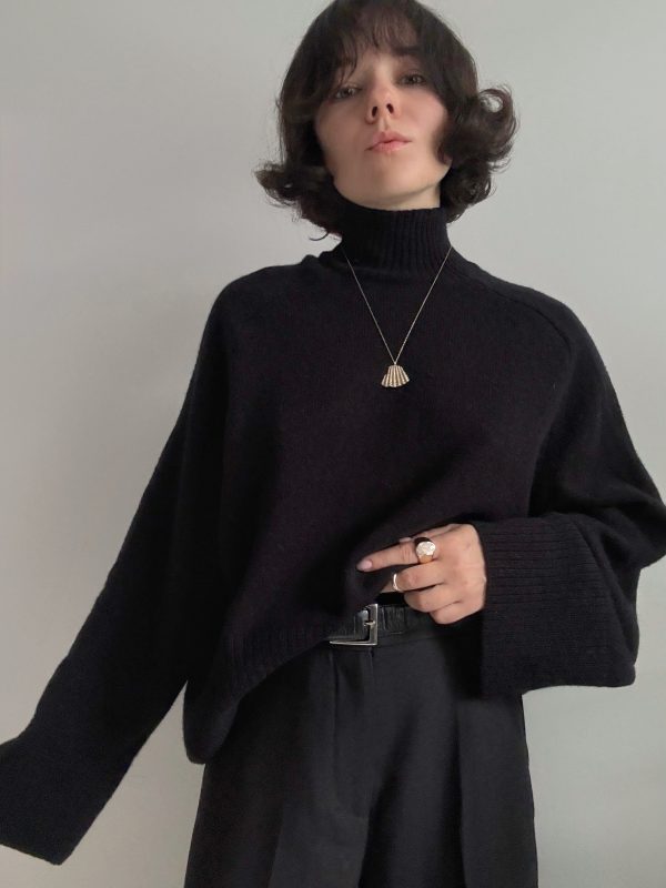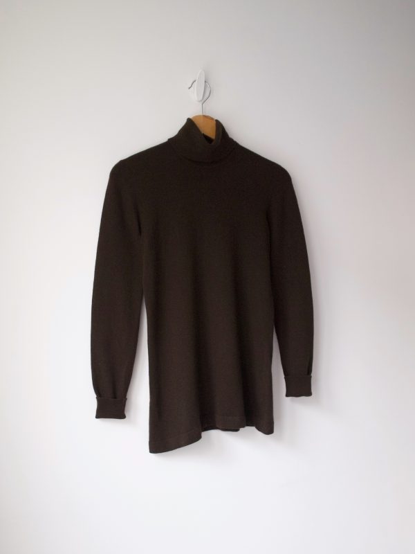 Cienki, kaszmirowy golf o dopasowanym fasonie. Renomowana marka Pringle of Scotland, która specjalizuje się w produkcji wysokiej jakości kaszmirowych ubrań. Z tyłu golfu znajduje się drobne cerowanie, które jest całkowicie niewidoczne podczas noszenia.