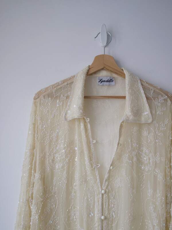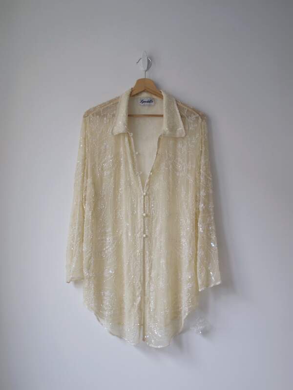 280,00 złUnikatowa bluzka vintage, rozszyta po całości koralikami oraz cekinami. Wykonana z cieniutkiego jedwabiu. Prawdopodobnie nigdy nie była noszona, ma jeszcze dołączoną torebkę z zapasowymi koralikami.