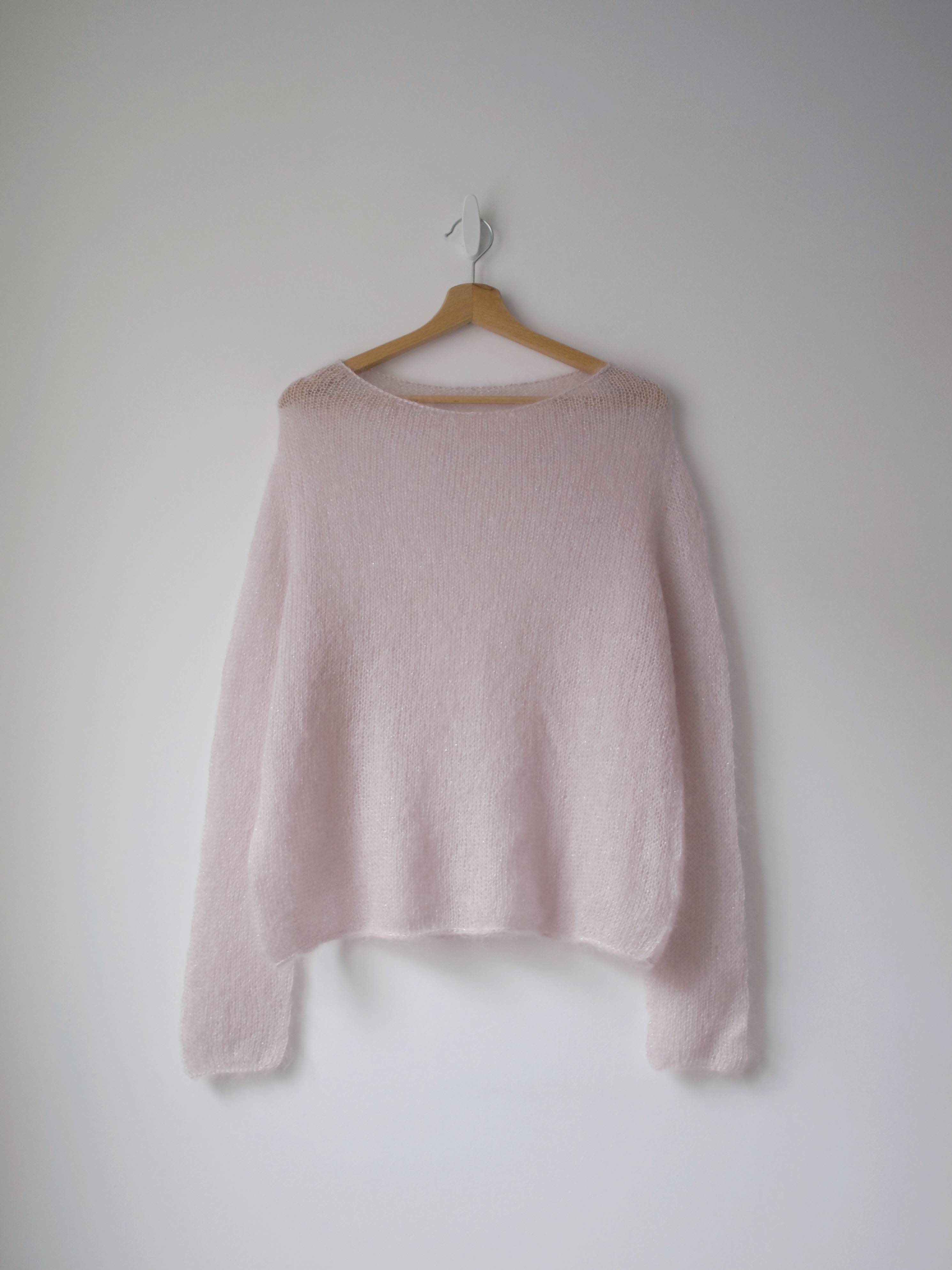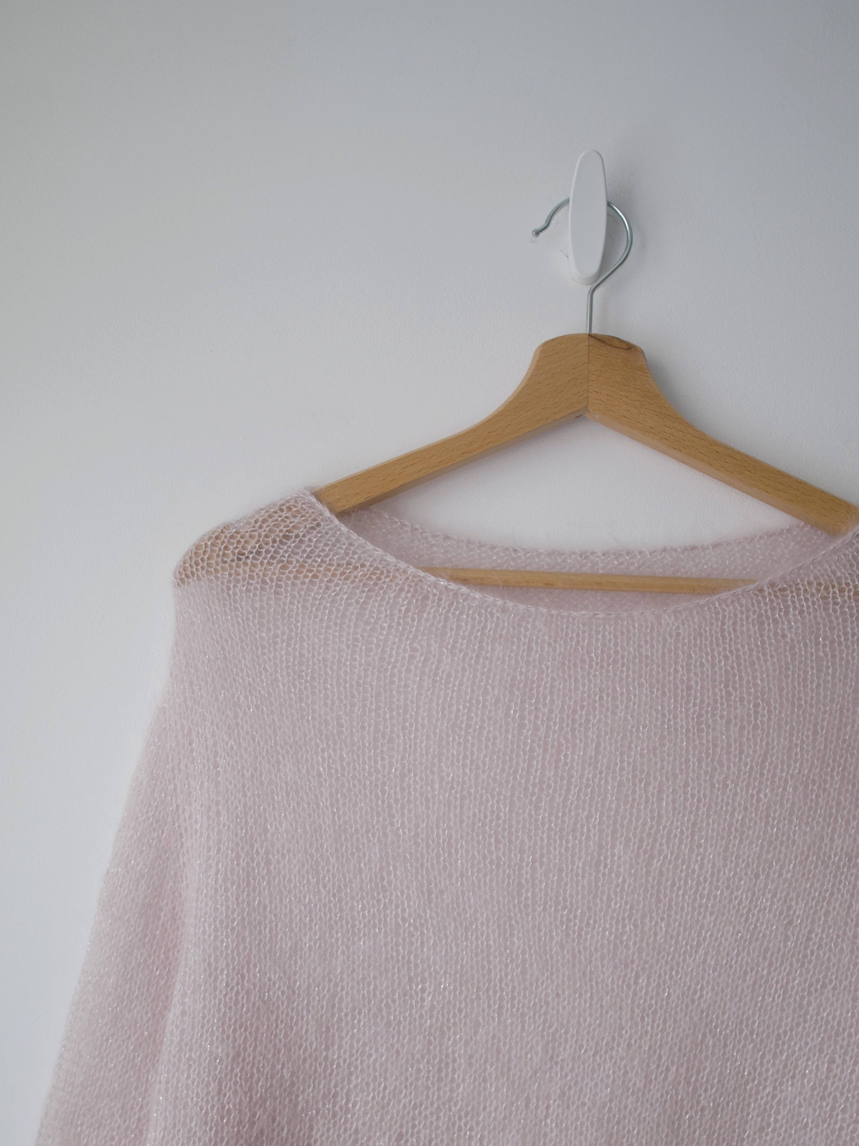 Ręcznie robiony sweter, wykonany z bardzo miłej i puszystej włoczki z małym dodatkiem nici metalizowanej.