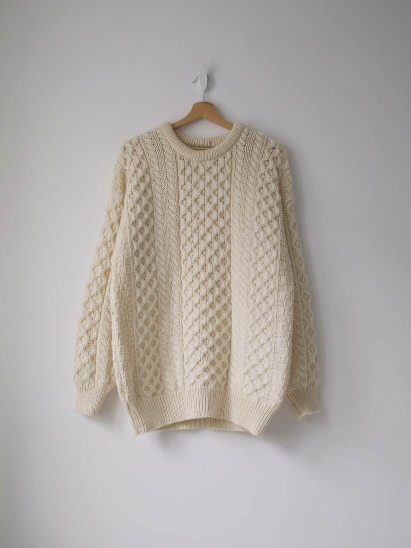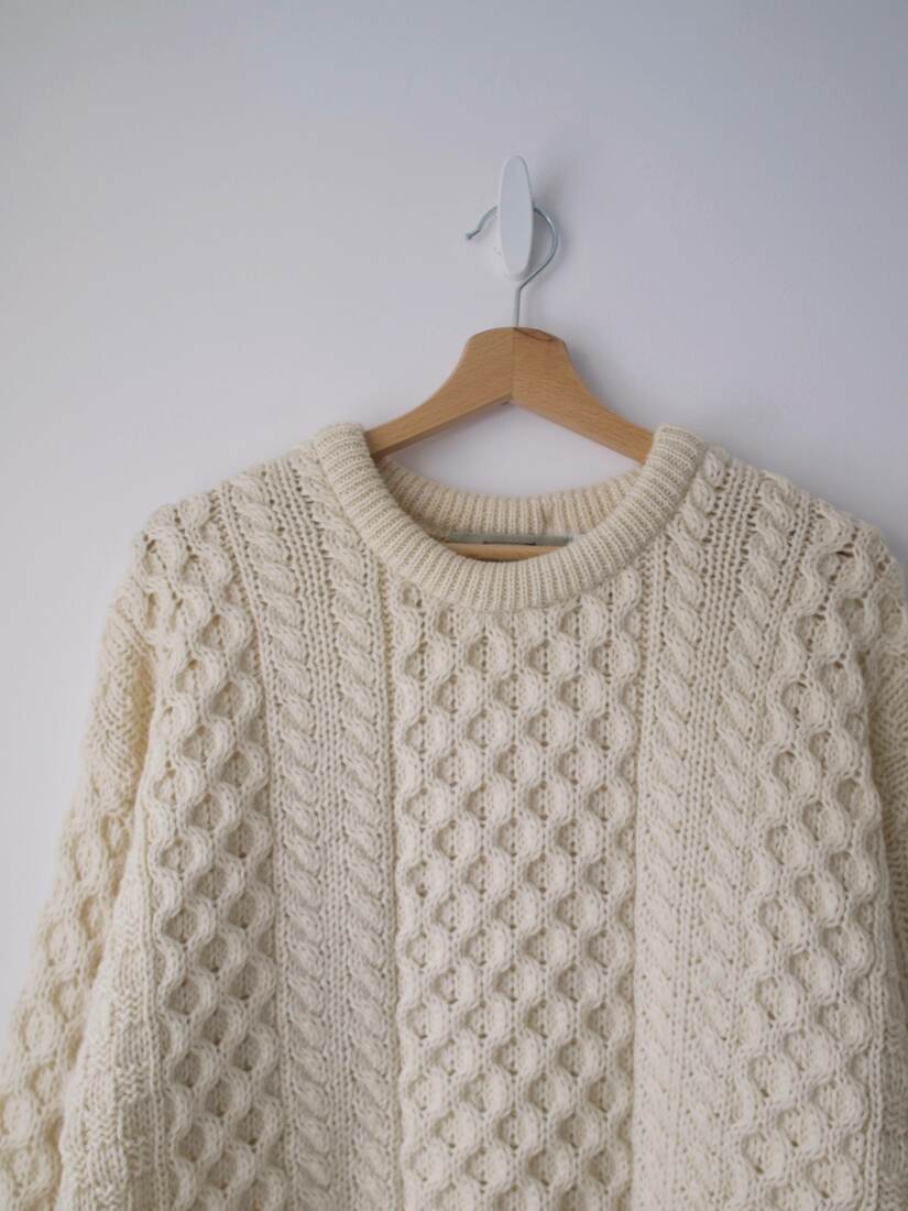 Sweter ekskluzywnej marki Aran Sweater Market. Cena na stronie marki 150 eur. Kolor kremowy.