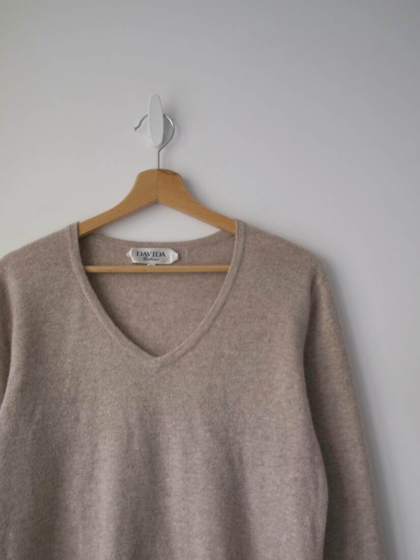 Sweter skandynawskiej marki Davida, specjalizującej się w produkcji kaszmirowych ubrań. Dzianiny tej marki posiadają certyfikat OEKO-TEX.