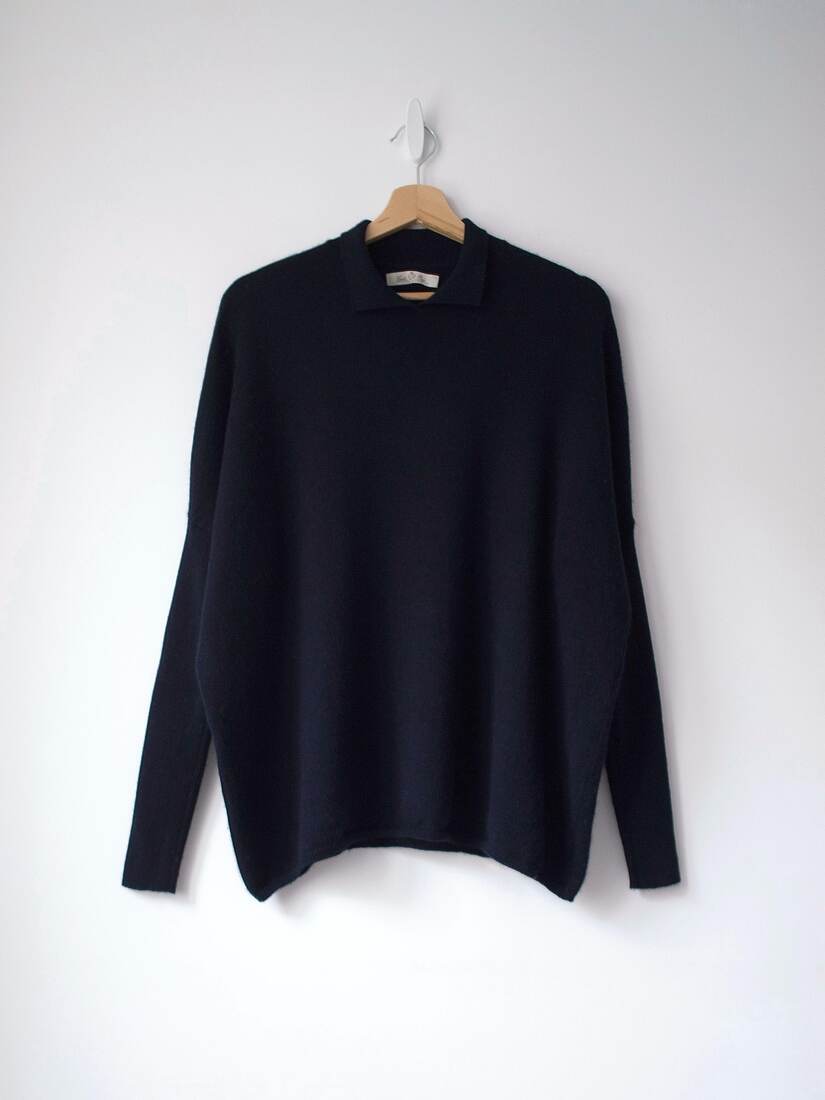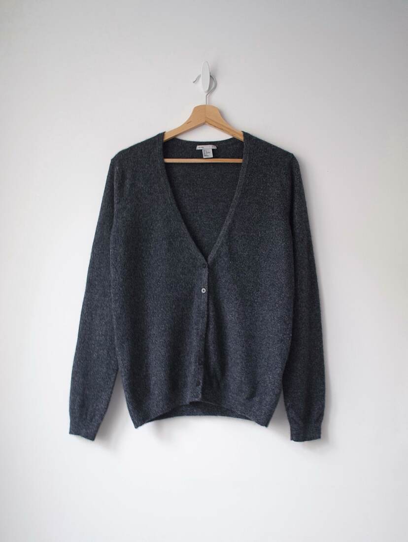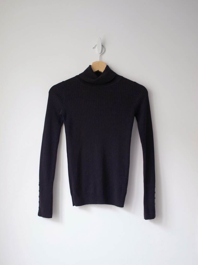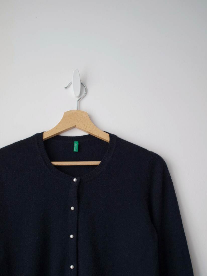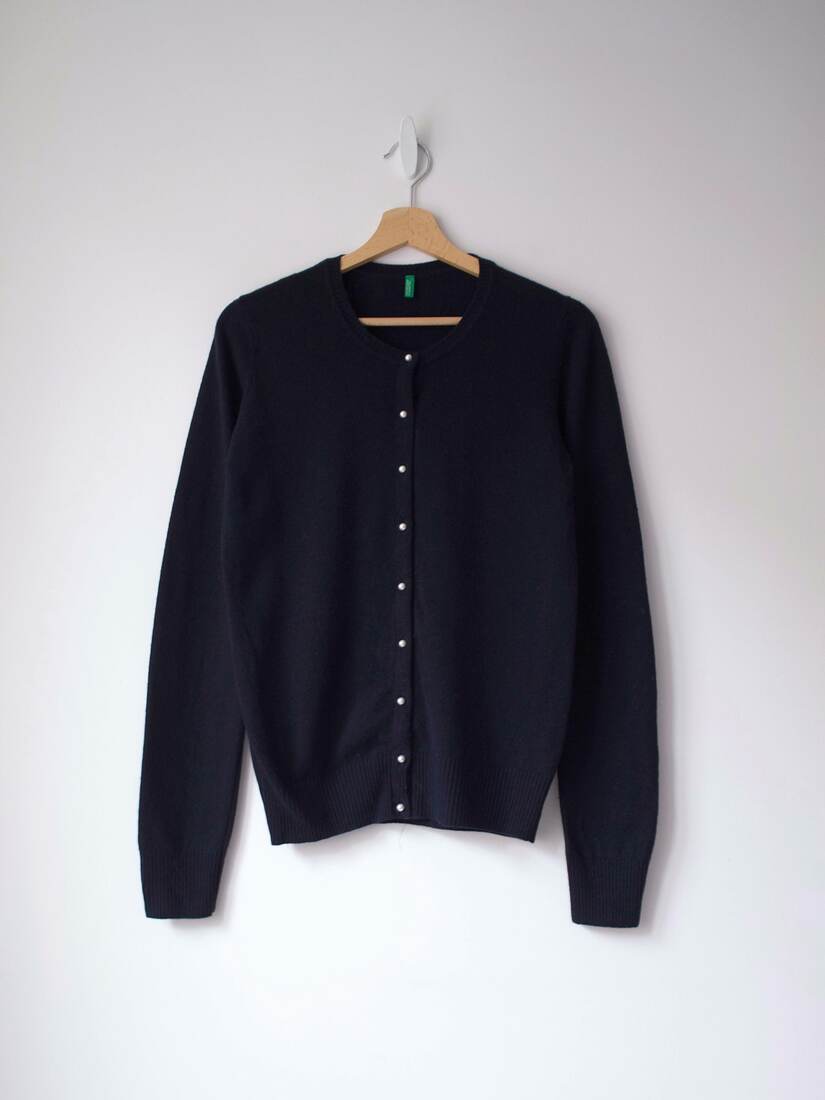 100,00 złSweter marki Benetton, zapinany na guziki w kształcie perełek. Kolor to bardzo ciemny granat, prawie czarny.