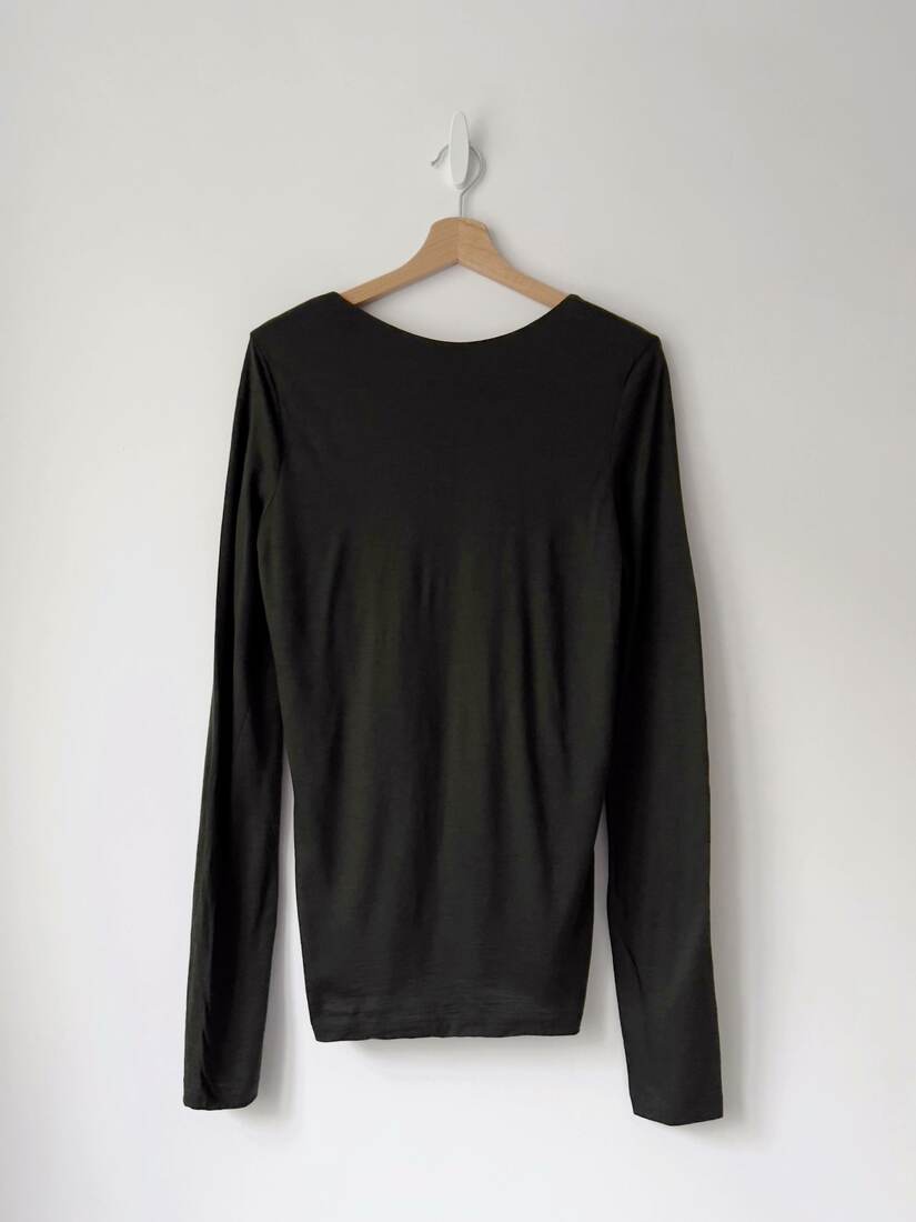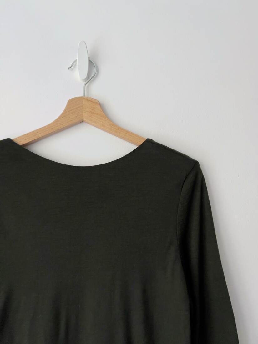 60,00 złCienka wełniana bluzka marki COS. Na plecach dekolt. Ma małe zaciągnięcie materiału (pokazaną na zdjęciach), nie jest widoczne w noszeniu. Kolor to ciemny zielony, w górnej części jest dwuwarstwowa.
