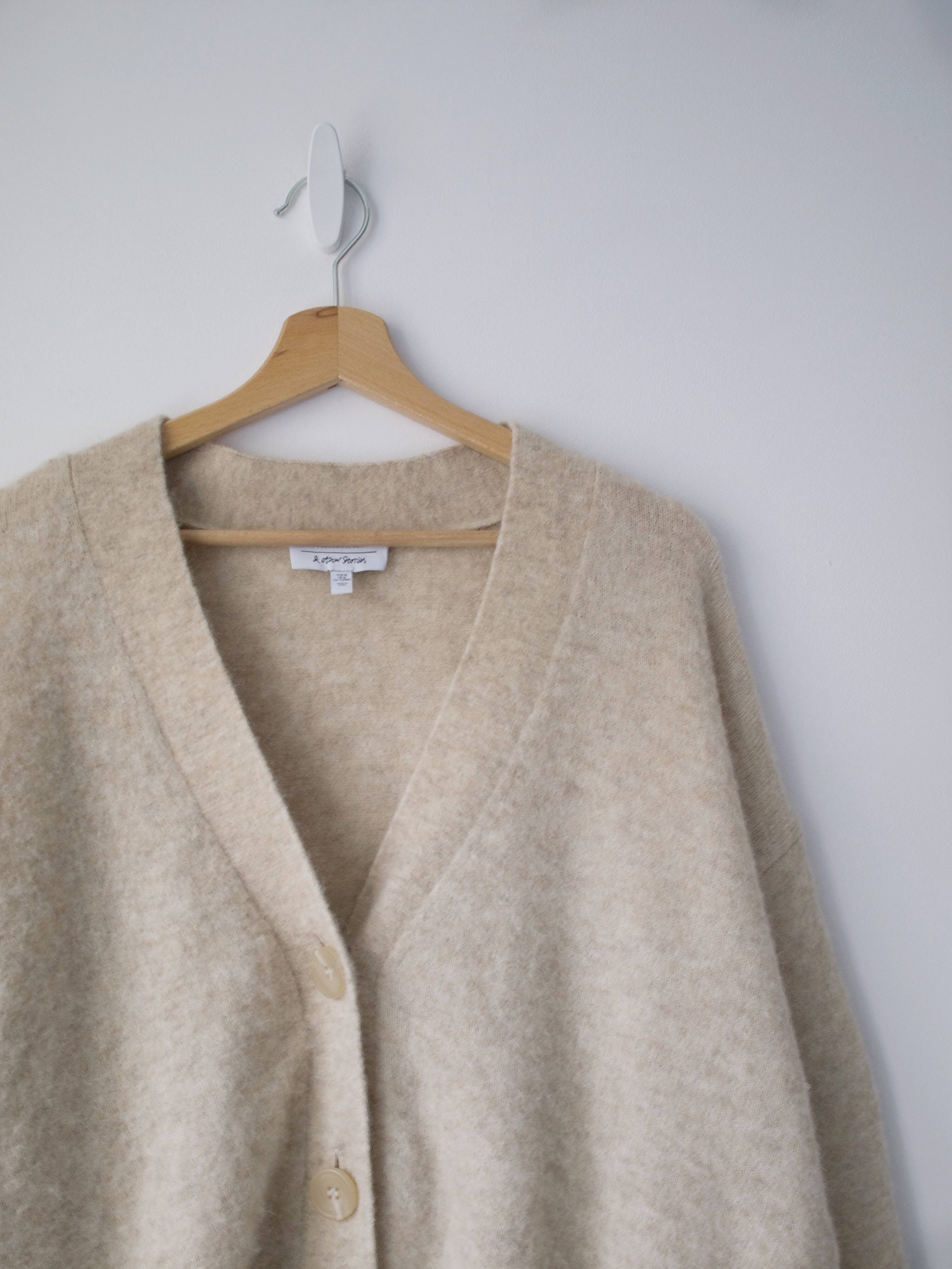 Kardigan o luźnym fasonie, skandynawska marka &Other Stories. Rozmiar z metki: M, fason oversize’owy Skład: 32% wełna, 32% alpaka, 33% poliamid, 3% elastan Stan: idealny Szerokość w klatce 64 cm Długośćcałkowita 56 cm