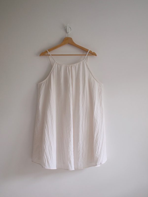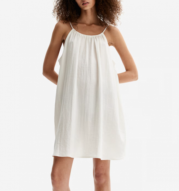 Krótka sukienka o kroju A-Line, wykonana z tkaniny o marszczonej strukturze. Luźny fason z dekoltem ze sznurkiem, wąskimi ramiączkami oraz wiązaniami z tyłu. Bez podszewki.