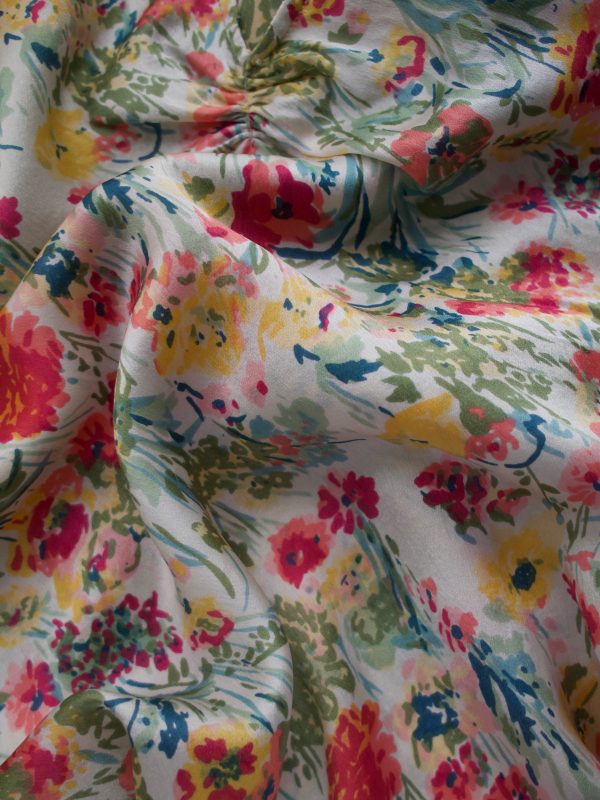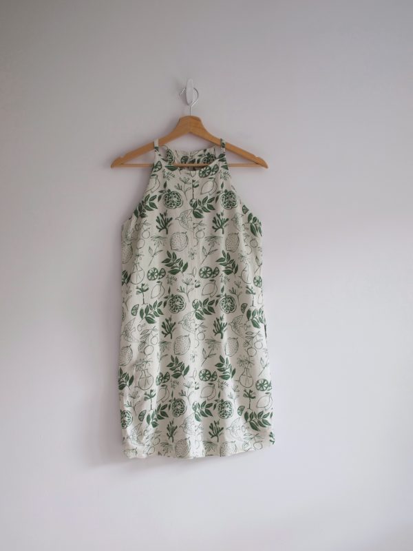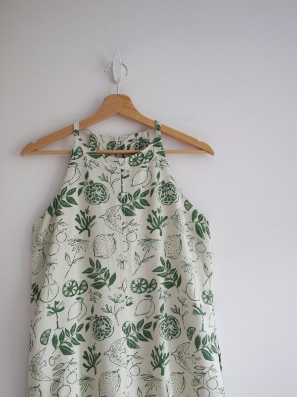 Sukienka w piękne wzory z włoskim motywem. Uszyta z miękkiej i przewiewnej mieszanki wiskozy i lnu. Ma dekolt z wycięciem w kształcie łezki na plecach.
