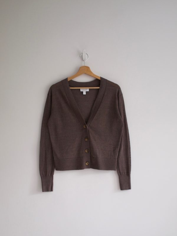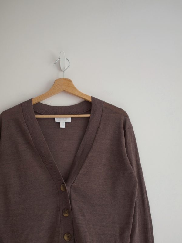 Kardigan brytyjskiej marki The White Company w kolorze taupe. Wykonany z materiału z dużym udziałem lnu. Ma pudełkowy, nieco krótszy fason. Koszt nowego kardigana o tym samym składzie na stronie marki to £79.00 (około 400 zł).