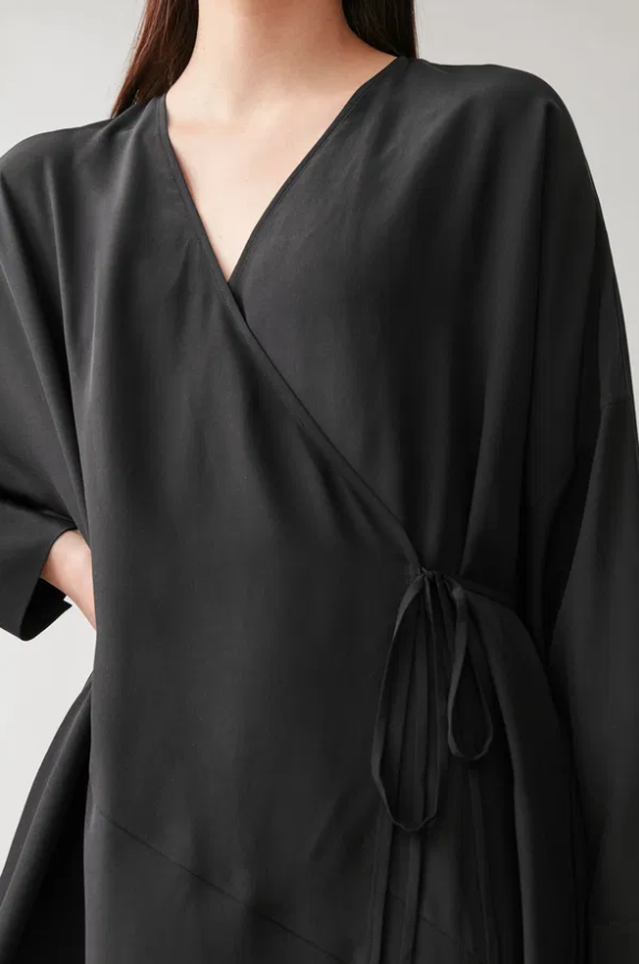 Sukienka marki COS o kopertowym kroju. W 100% wykonana z lekkiego, matowego jedwabiu. Ma kieszenie i wiązania, dzięki którym można ją dopasować w pasie. Cena katalogowa to £150, czyli ponad 750 zł.