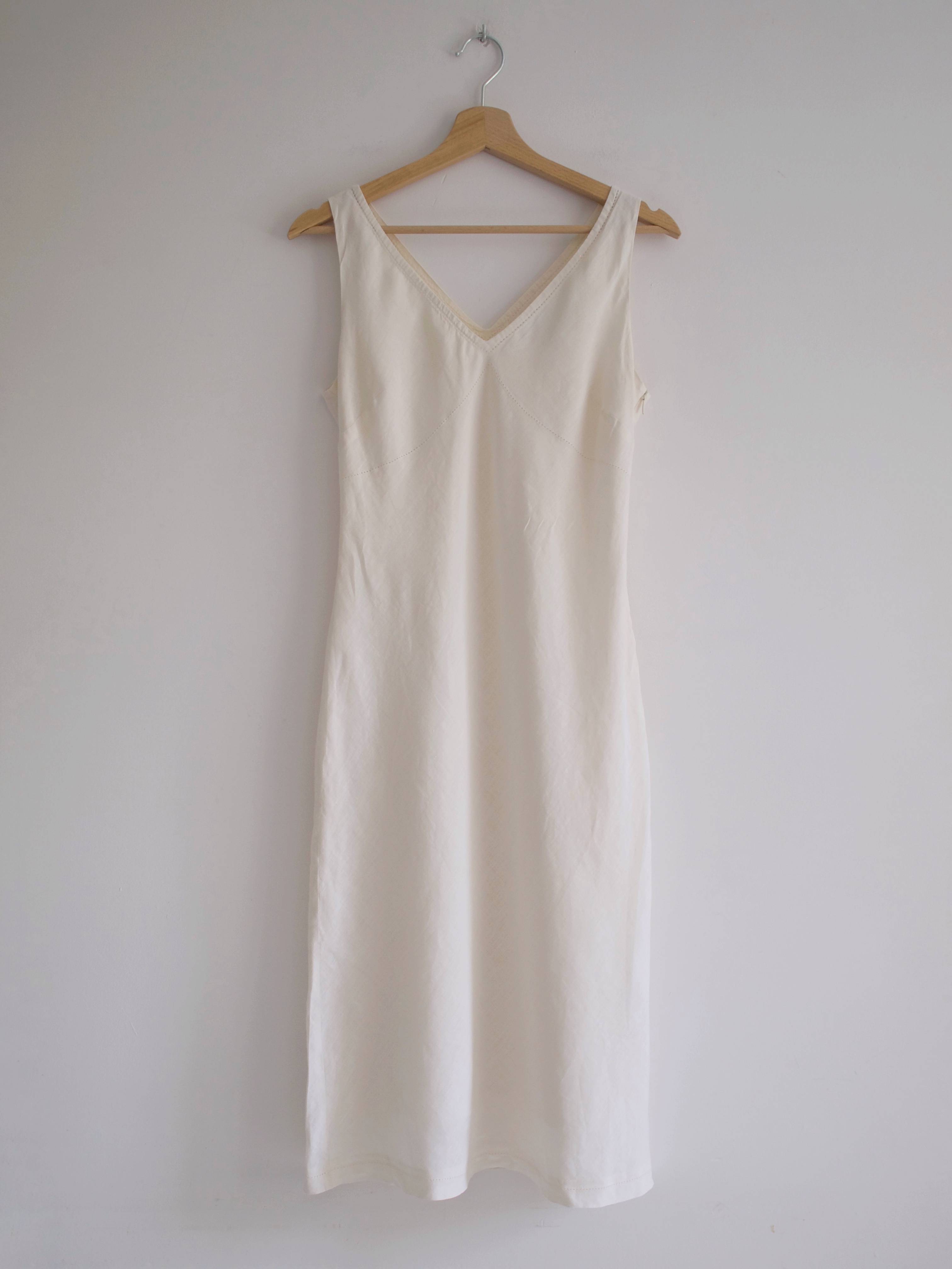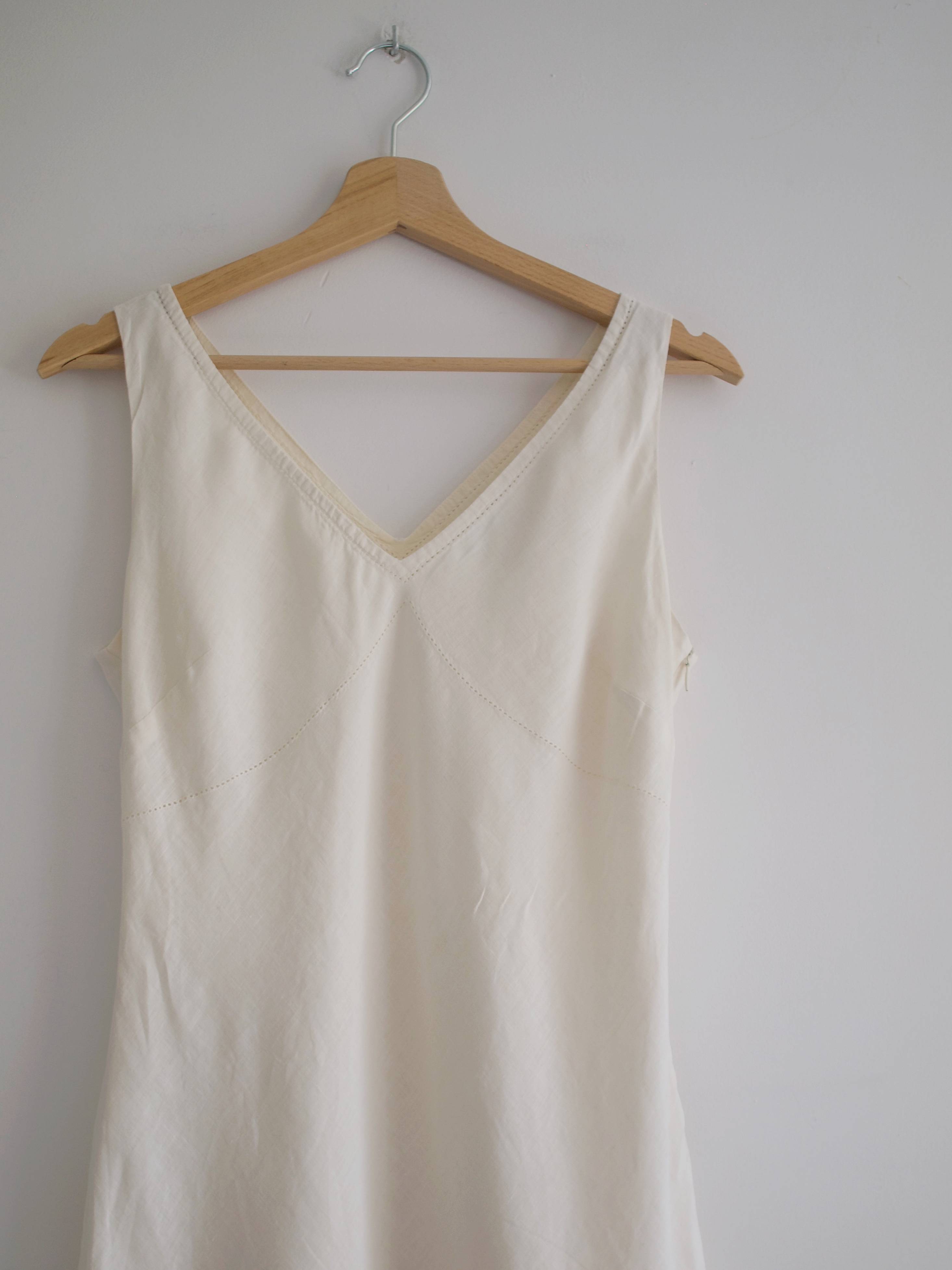 Rozmiar z metki: brak, polecam na S Skład: 100% len, podszewka 100% bawełna Stan: bez wad Szerokość w klatce 44 cm Szerokość w pasie 37 cm Szerokość w biodrach 48 cm Długośćcałkowita 109 cm