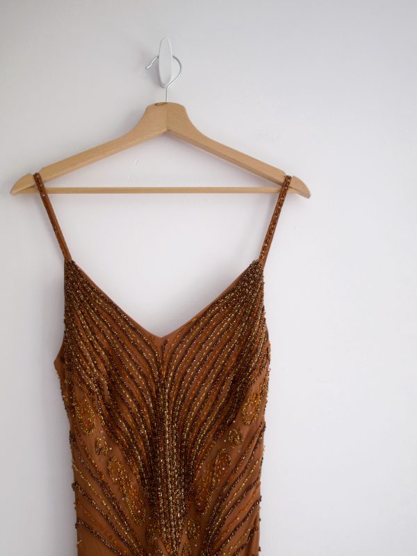 220,00 zł176,00 złUnikatowa sukienka vintage, ręcznie zdobiona koralikami i cekinami. Wykonana z cieniutkiego jedwabiu, szyta ze skosu, dzięki czemu pięknie się układa. Zapinana na boczny zamek. W niektórych miejscach brakuje koralików, jednak nie jest to widoczne i nie przeszkadza w noszeniu.