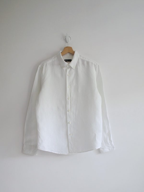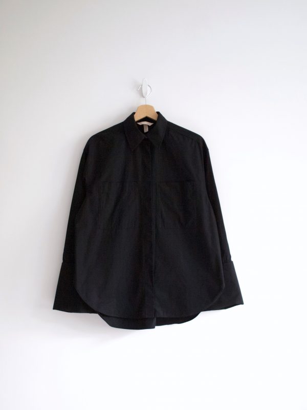 100,00 złObszerna koszula z bawełnianej tkaniny. Obniżone ramiona, długie szerokie rękawy zakończone szerokim podwijanym mankietem z rozcięciem i ozdobnymi guzikami. Naszywane kieszenie na piersi.